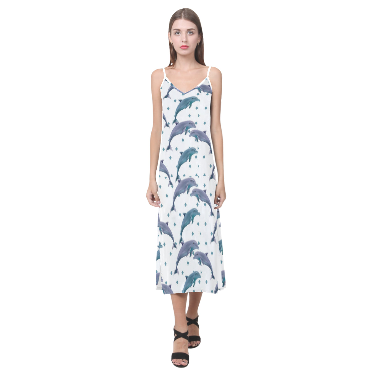 Dolphins pattern dotted background V-Neck Open Fork Long Dress is a uniqued design and limited item. It made to order, hand printed, and sewn with love in our factory.