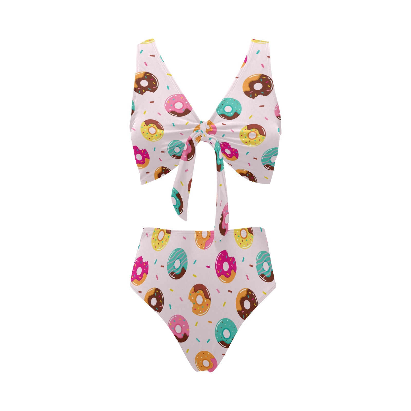 Donut pattern glaze pink background Chest Bowknot High Waisted Bikini Swimsuit