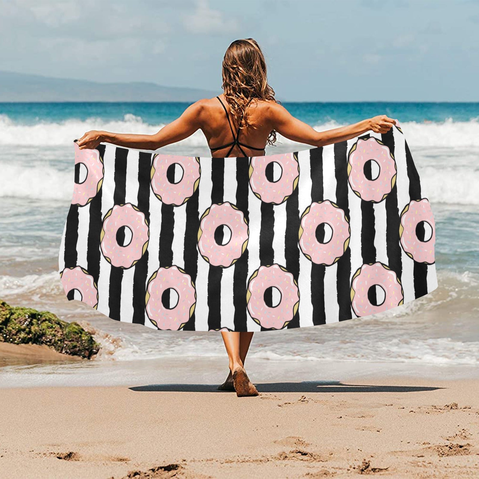 Donuts pink icing striped pattern Beach Towel