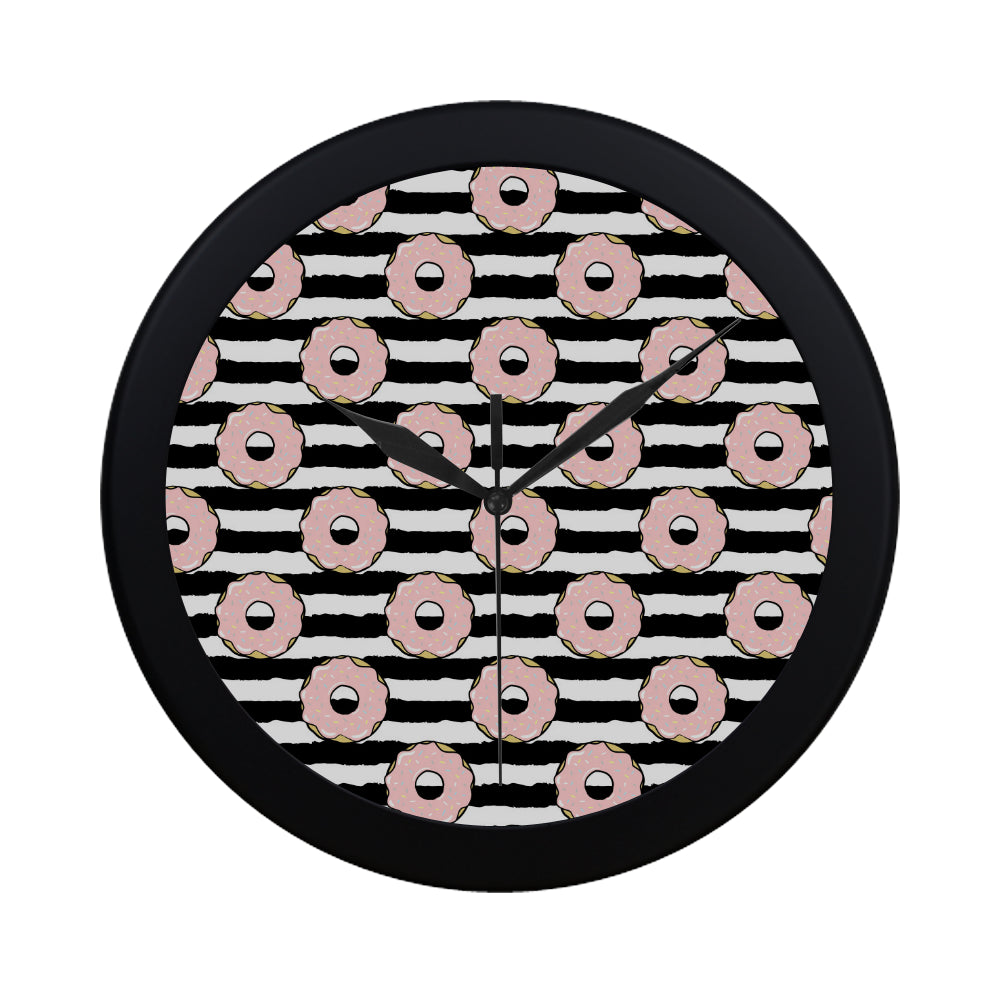 Donuts pink icing striped pattern Elegant Black Wall Clock
