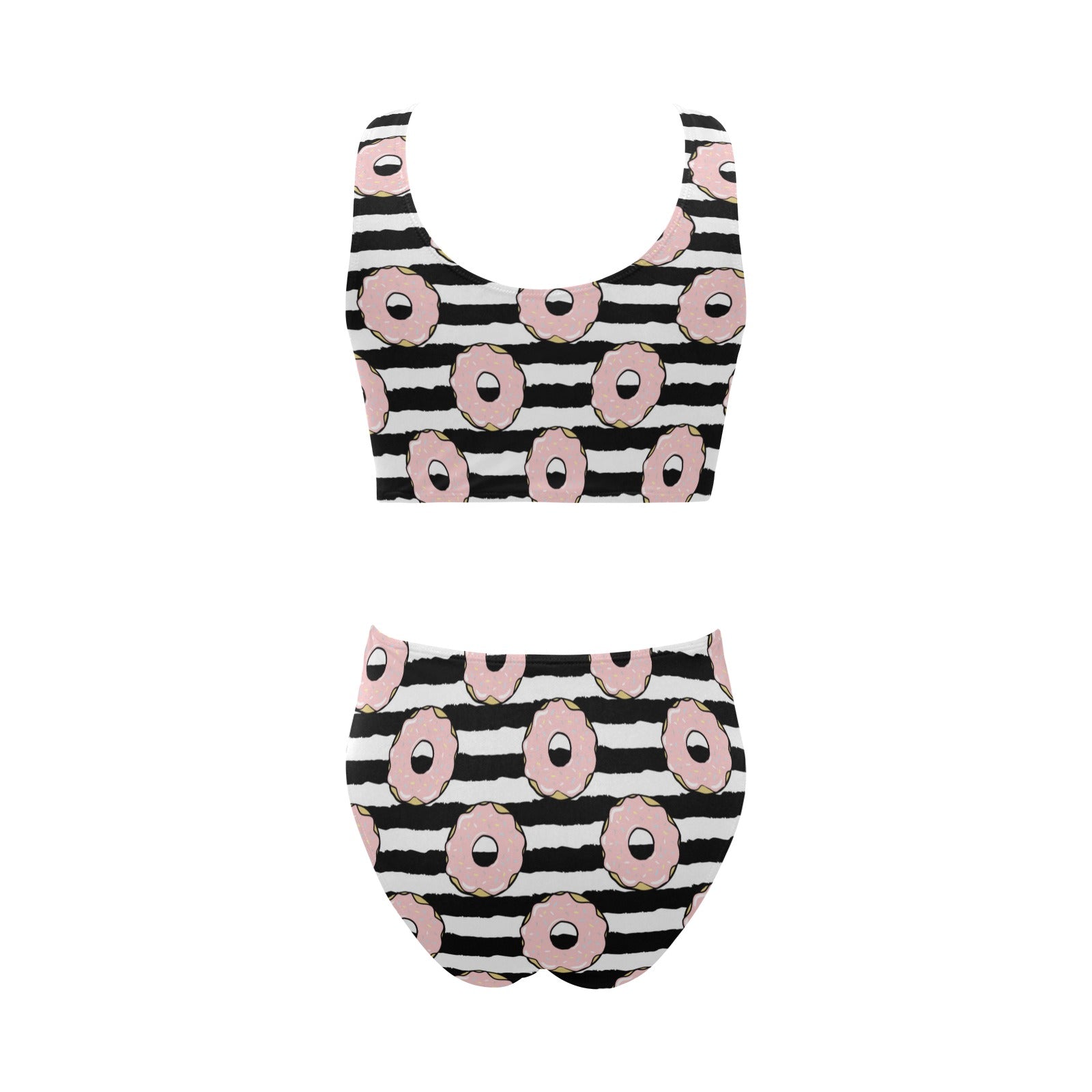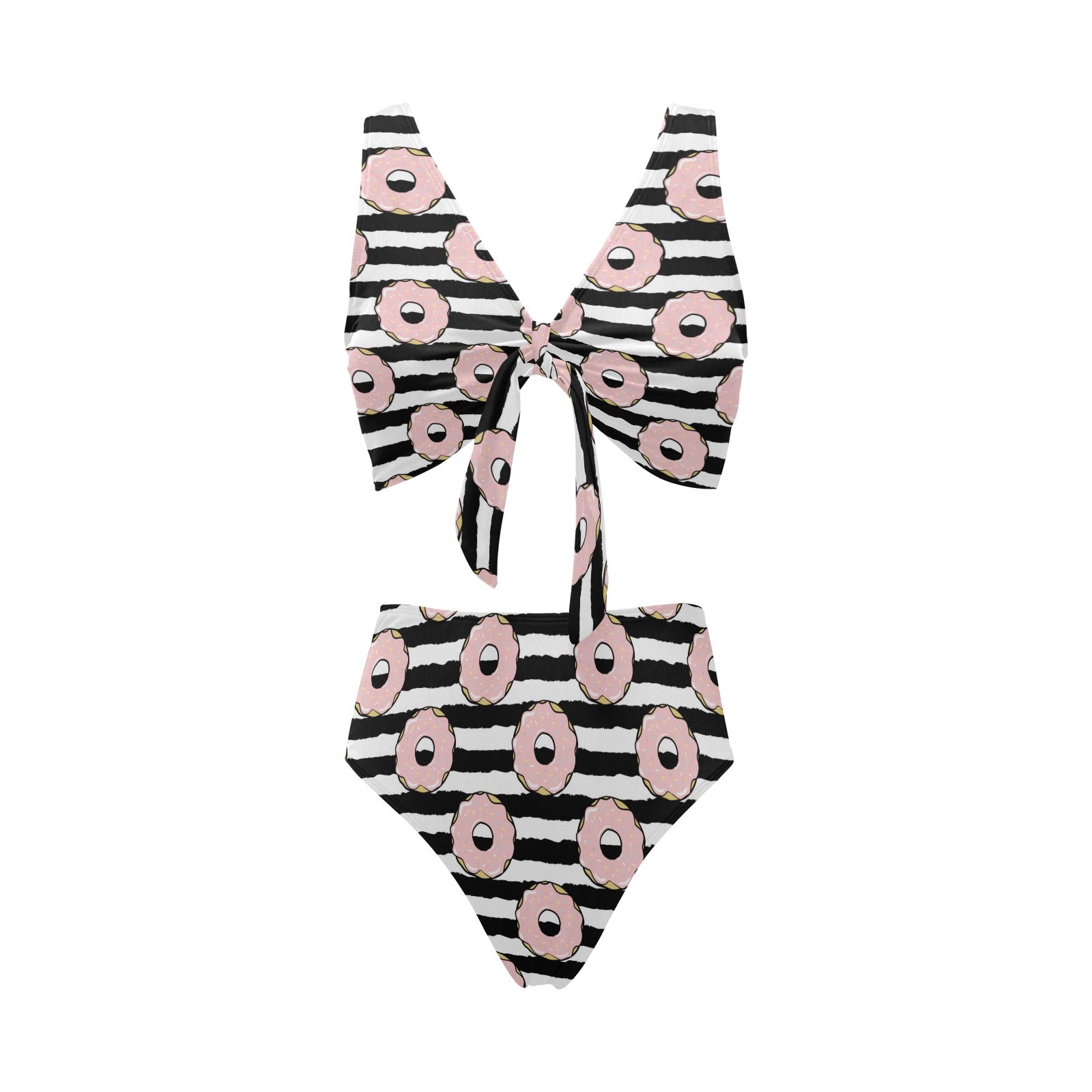 Donuts pink icing striped pattern Chest Bowknot High Waisted Bikini Swimsuit