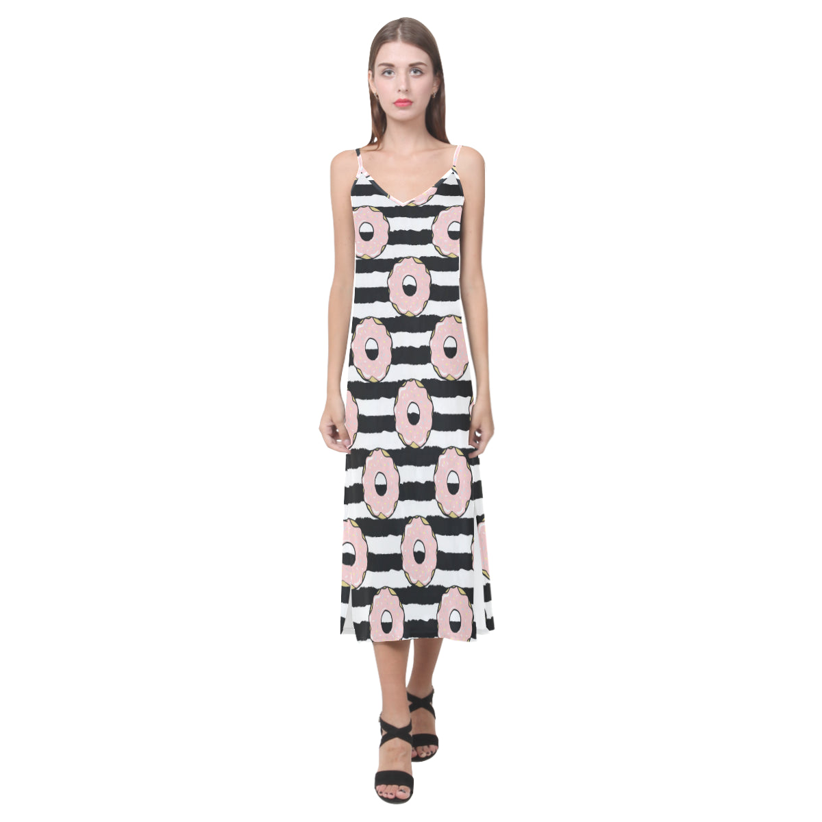 Donuts pink icing striped pattern V-Neck Open Fork Long Dress is a uniqued design and limited item. It made to order, hand printed, and sewn with love in our factory.