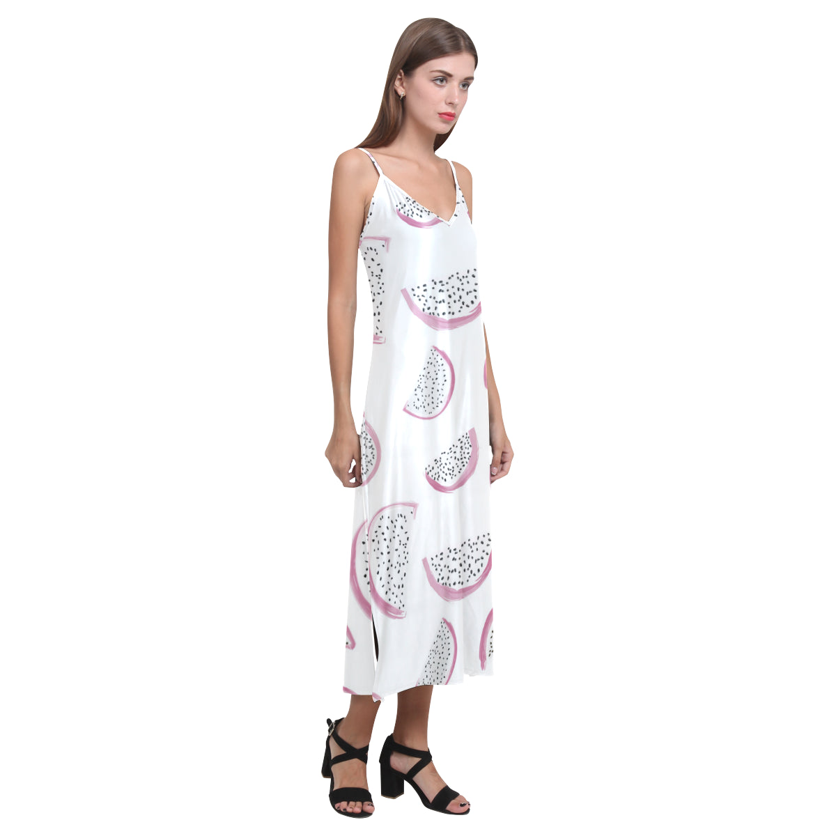 dragon fruit pattern V-Neck Open Fork Long Dress is a uniqued design and limited item. It made to order, hand printed, and sewn with love in our factory.