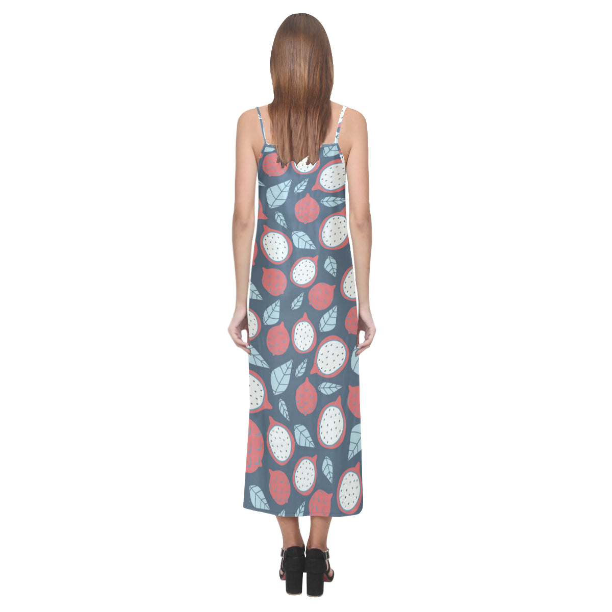 dragon fruits dark blue background V-Neck Open Fork Long Dress is a uniqued design and limited item. It made to order, hand printed, and sewn with love in our factory.