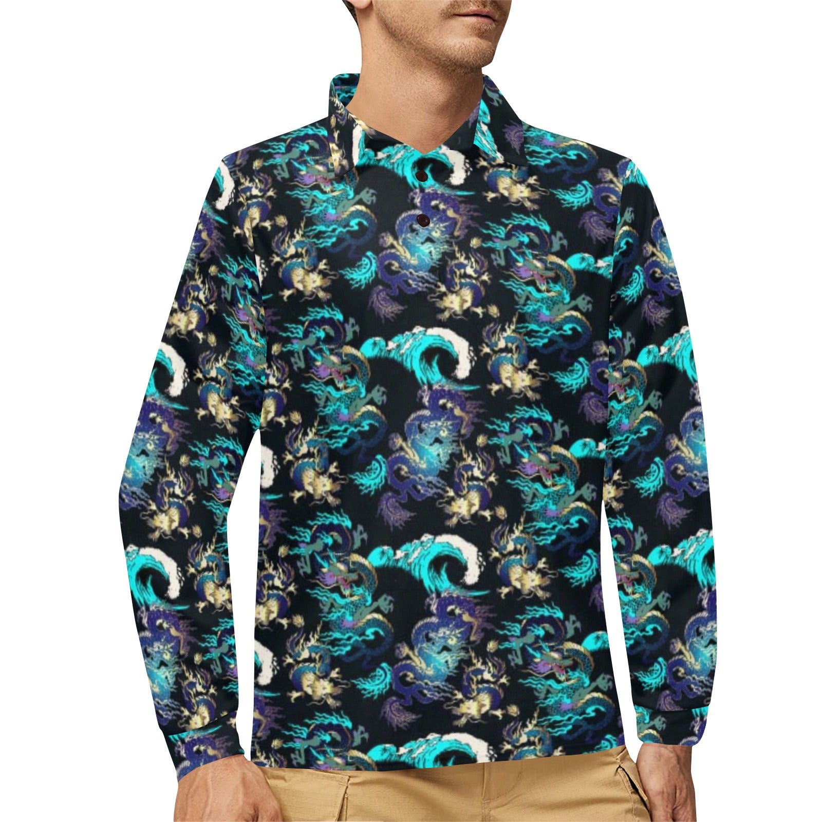 Dragon sea wave pattern Men's Long Sleeve Polo Shirt