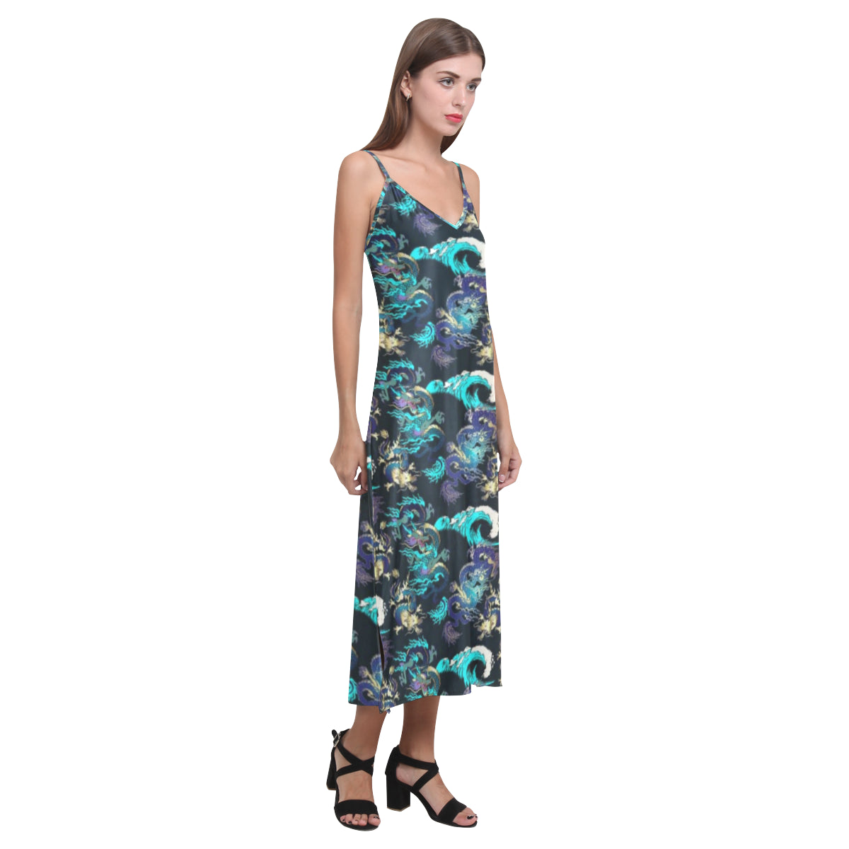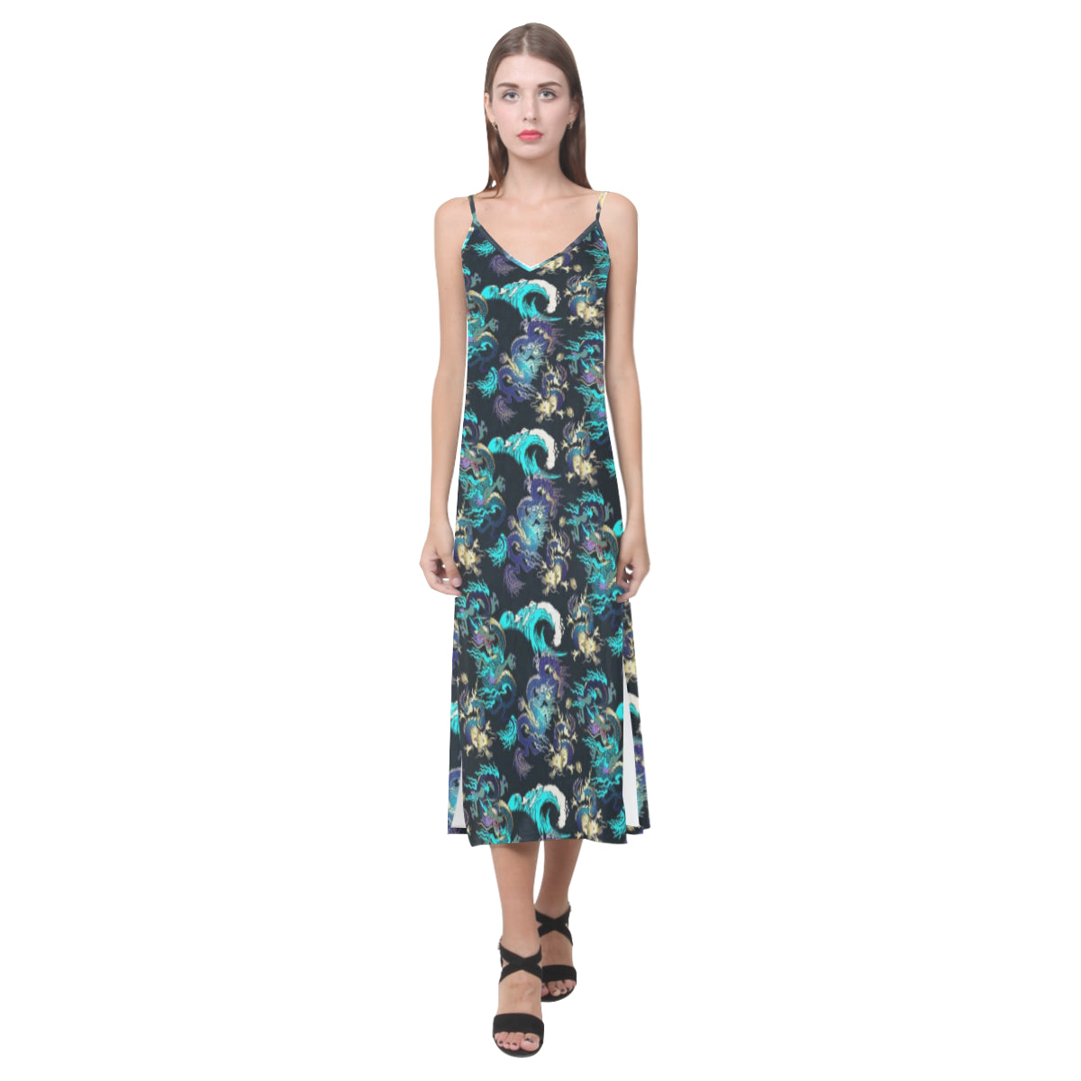 Dragon sea wave pattern V-Neck Open Fork Long Dress is a uniqued design and limited item. It made to order, hand printed, and sewn with love in our factory.