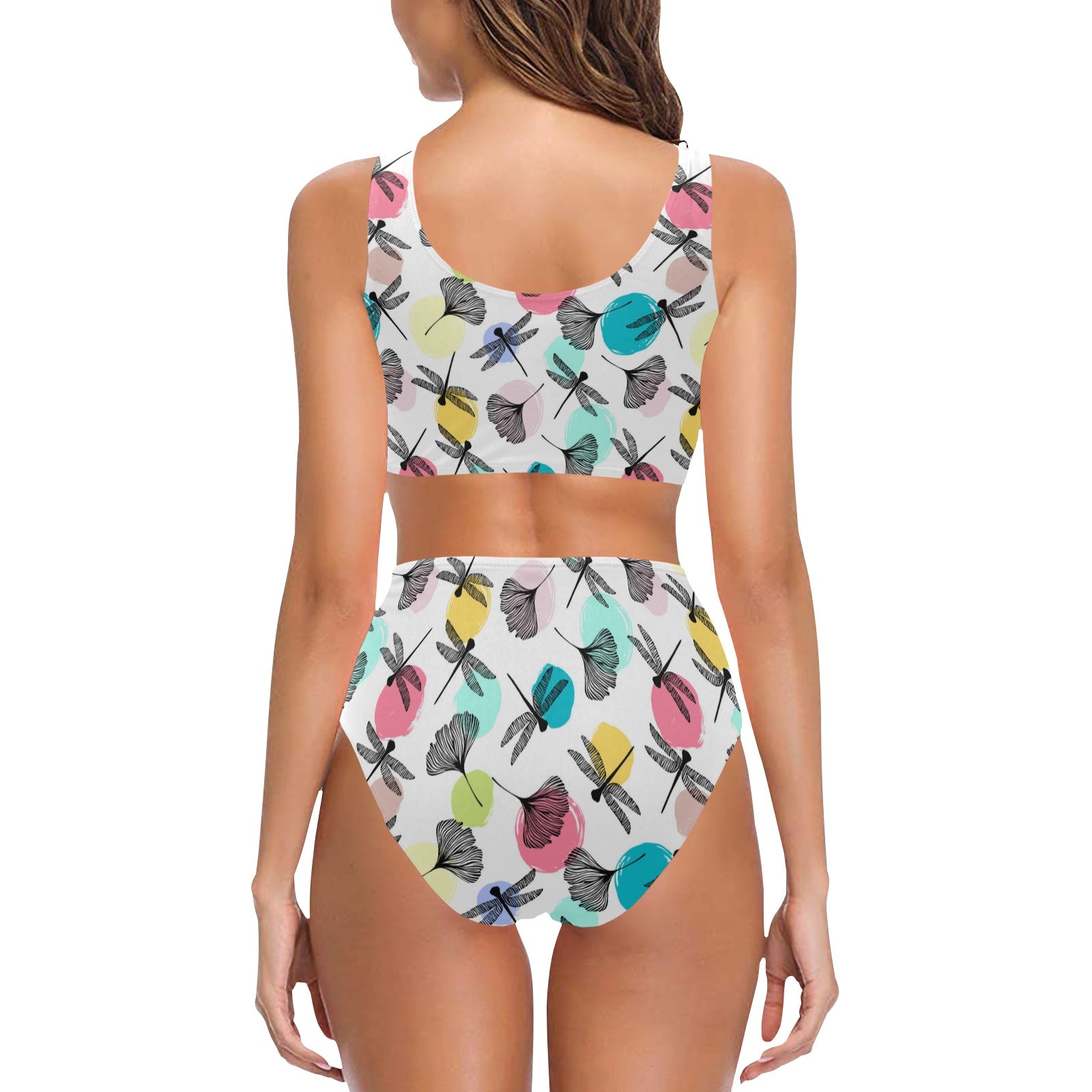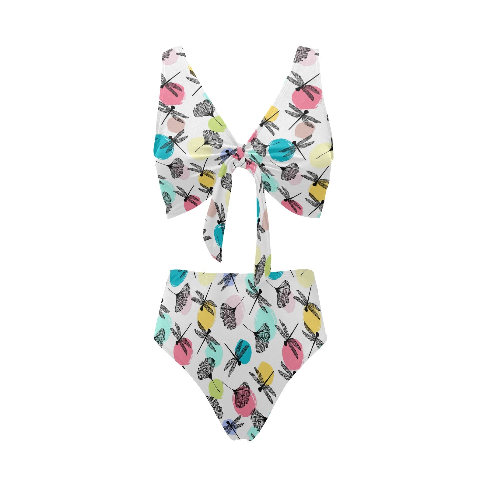 Dragonflies ginkgo leaves pattern Chest Bowknot High Waisted Bikini Swimsuit