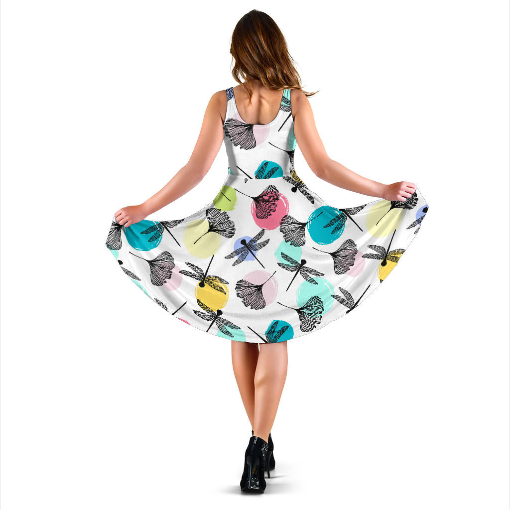 Dragonflies Ginkgo Leaves Pattern Sleeveless Midi Dress