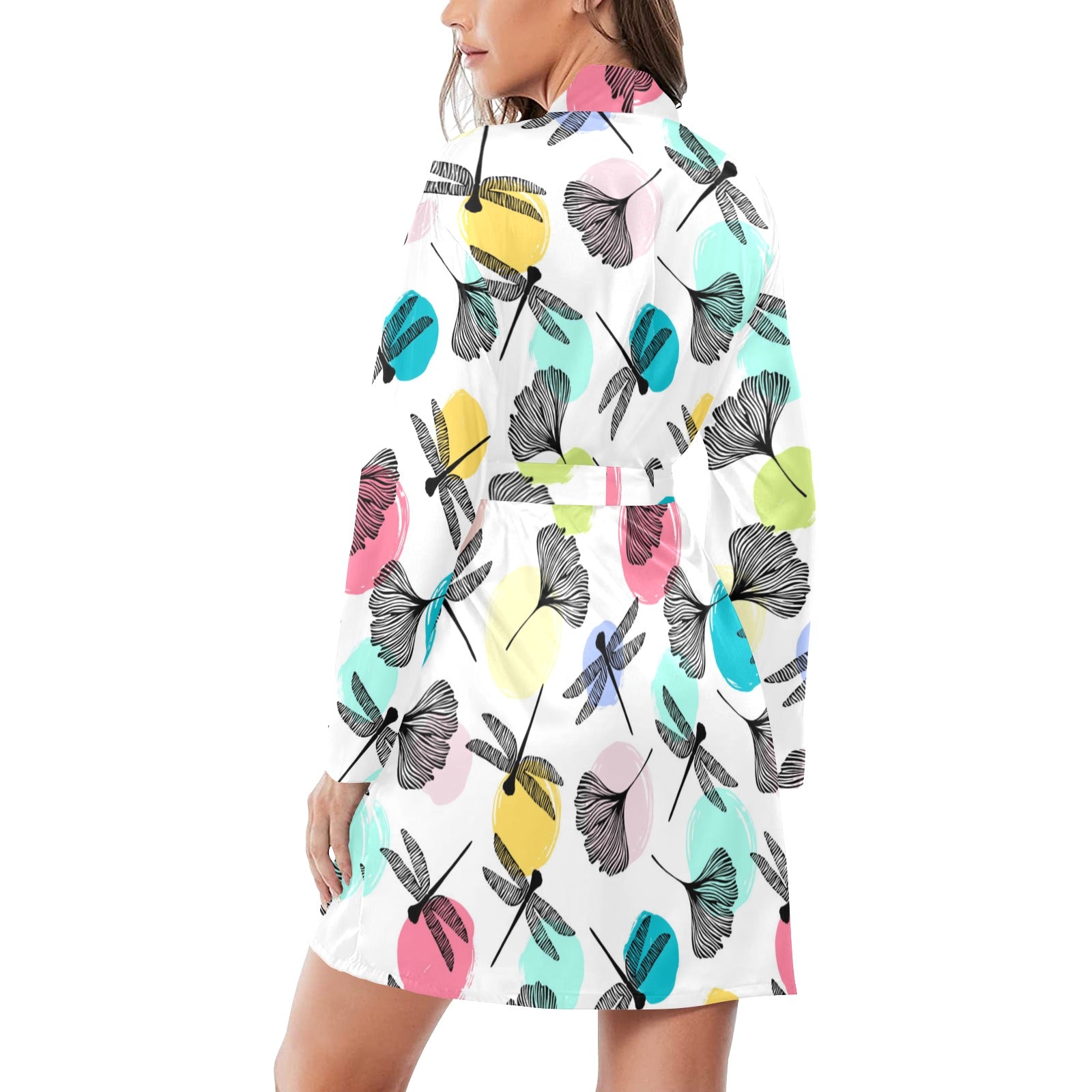 Dragonflies ginkgo leaves pattern Women's Long Sleeve Belted Night Robe