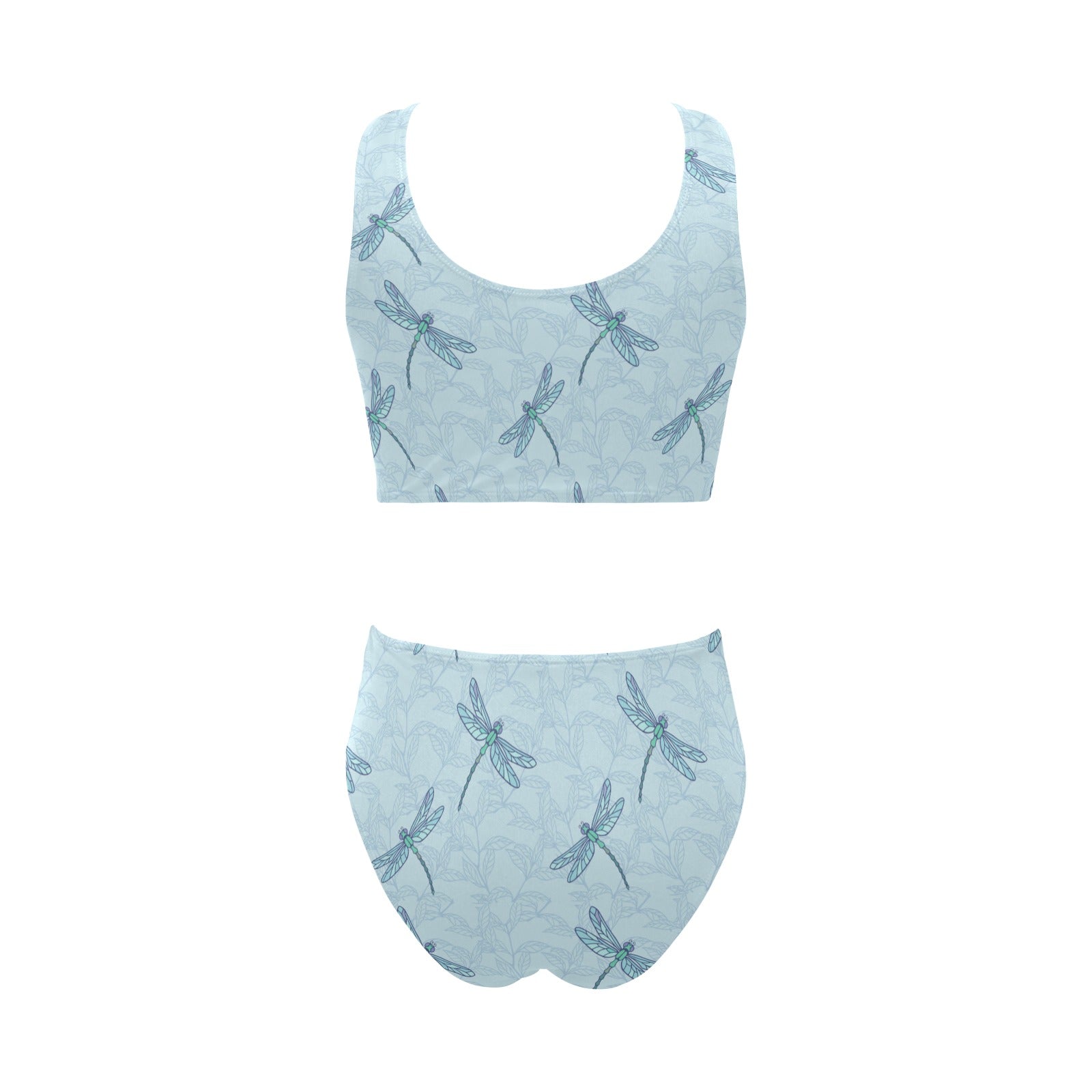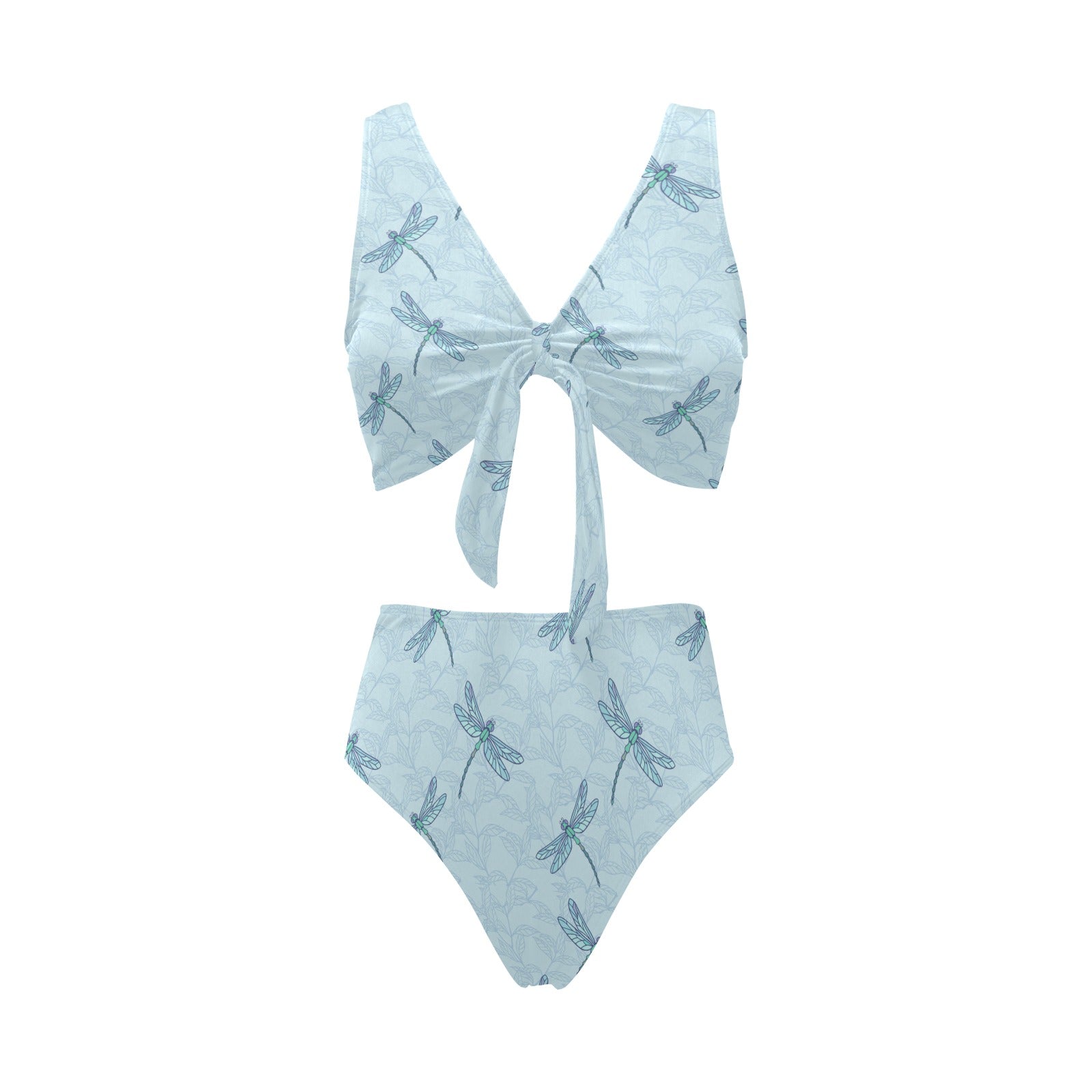 Dragonfly pattern blue background Chest Bowknot High Waisted Bikini Swimsuit