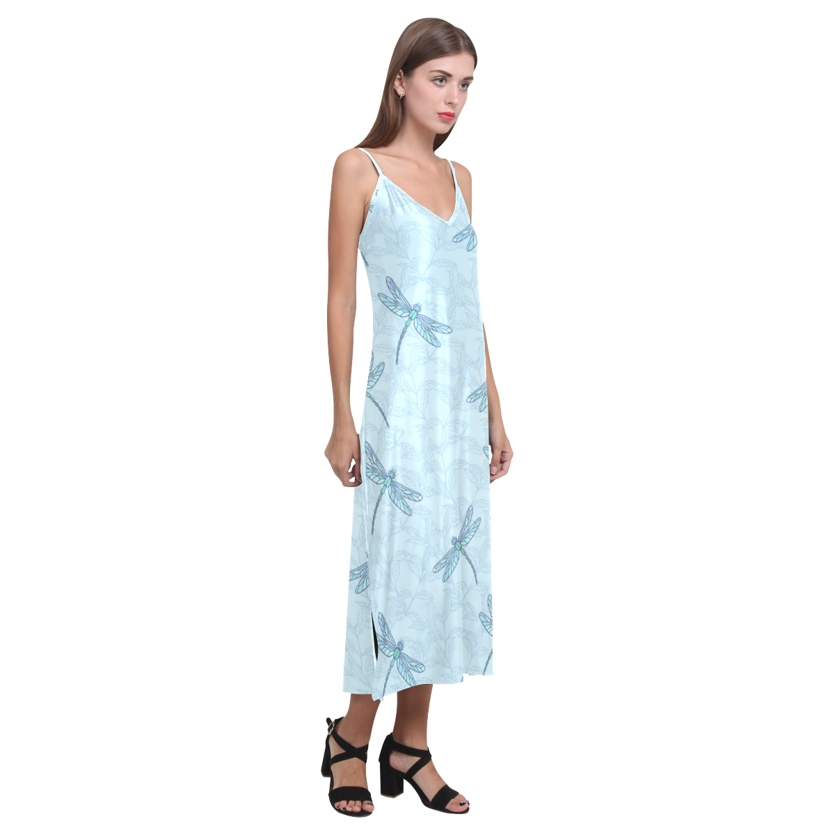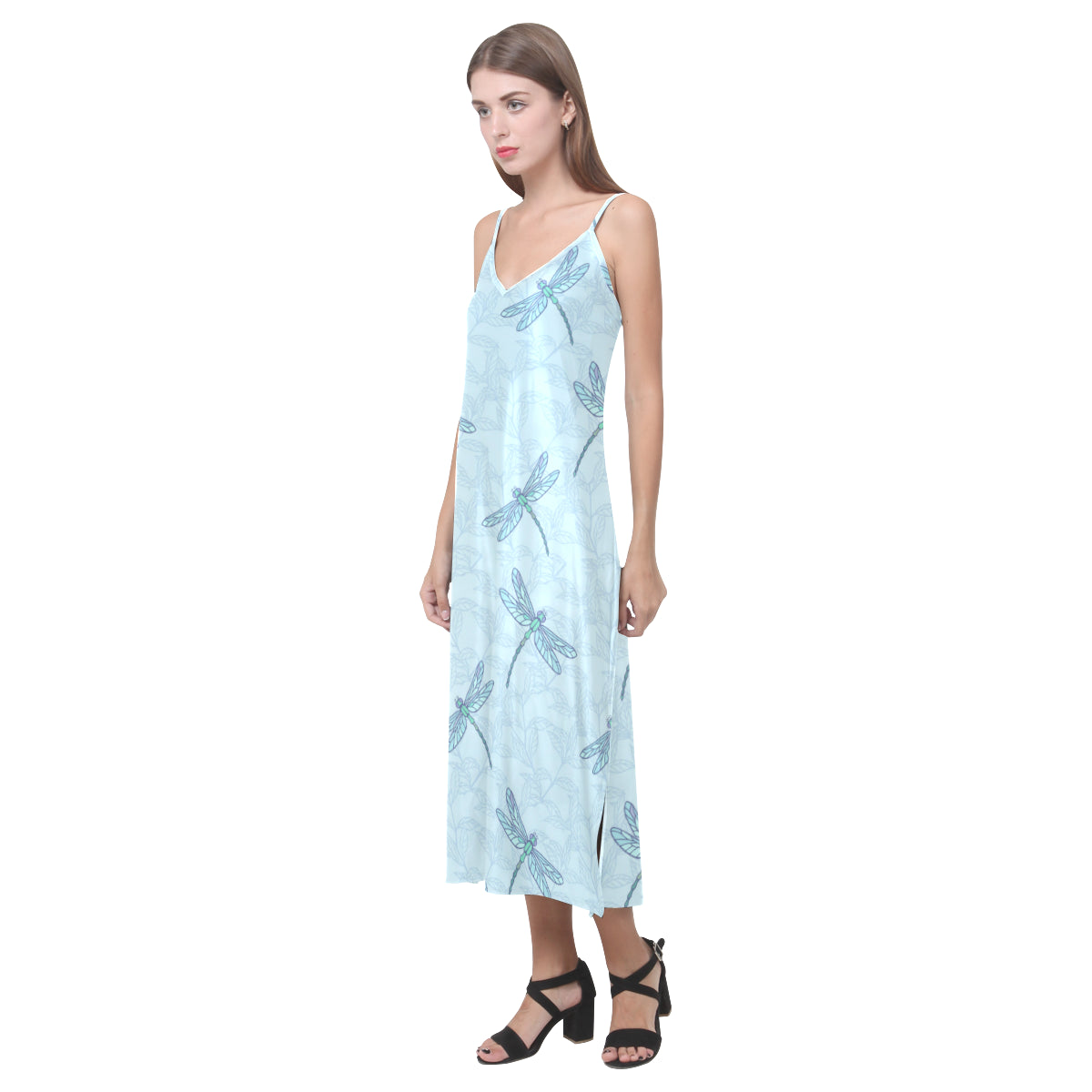 Dragonfly pattern blue background V-Neck Open Fork Long Dress is a uniqued design and limited item. It made to order, hand printed, and sewn with love in our factory.