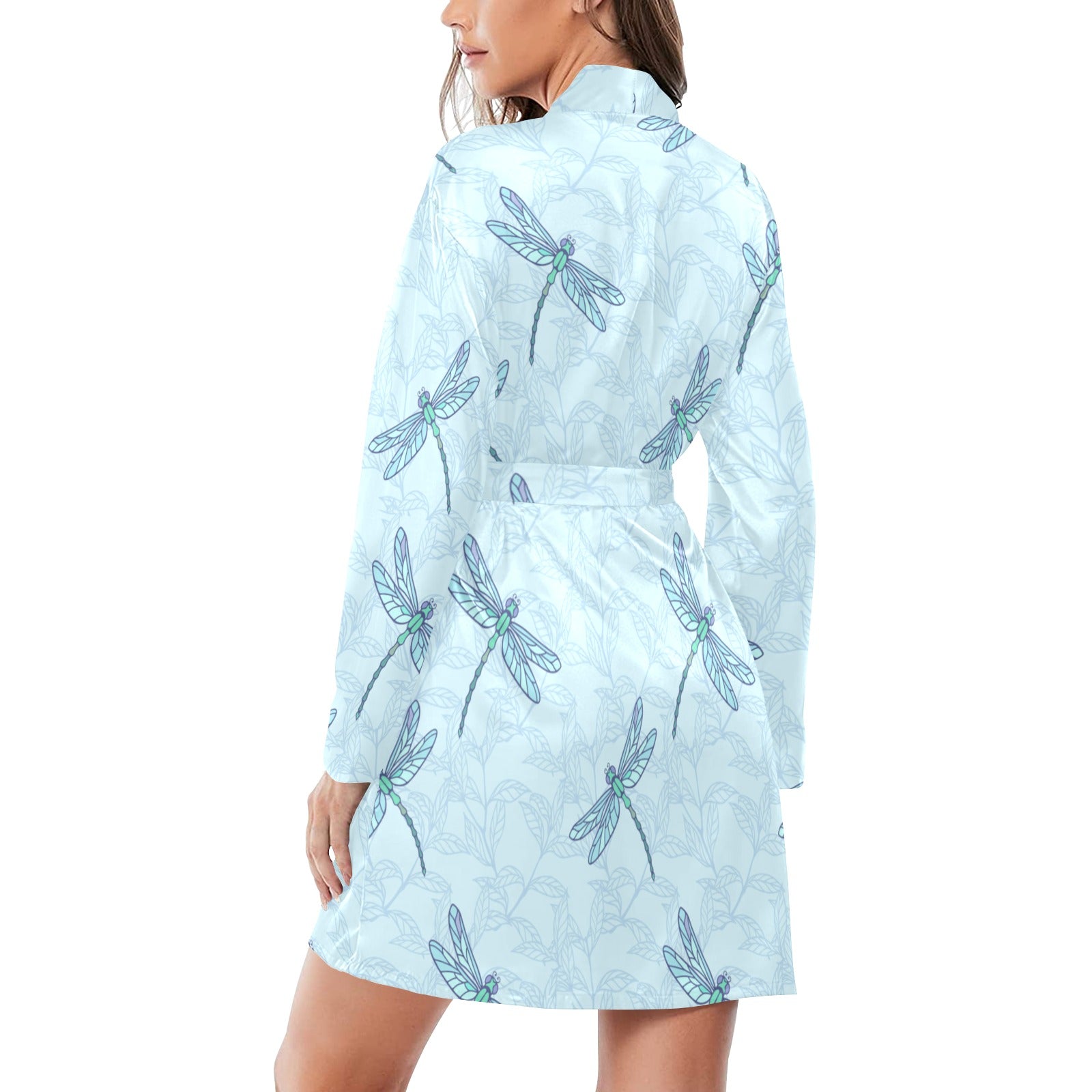 Dragonfly pattern blue background Women's Long Sleeve Belted Night Robe