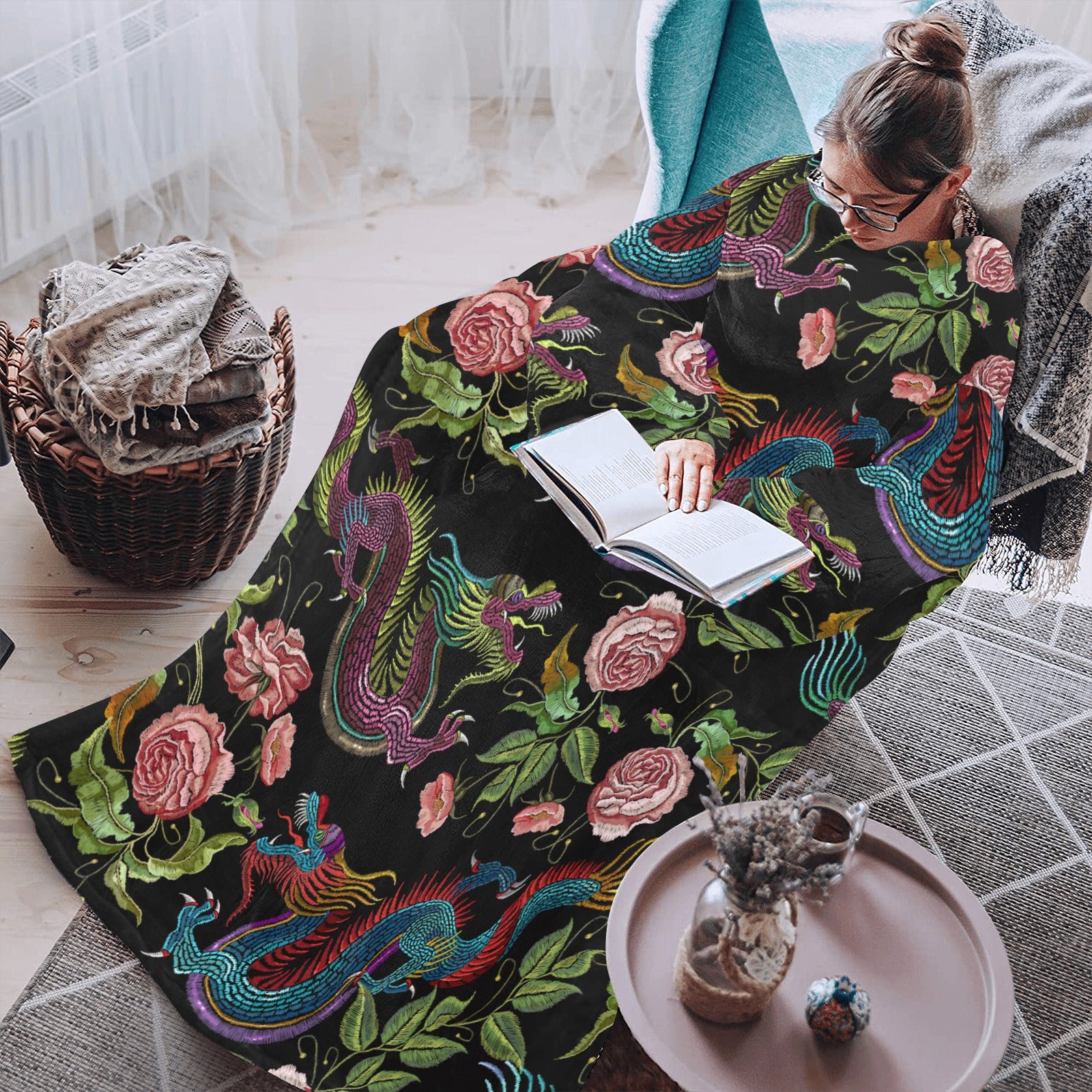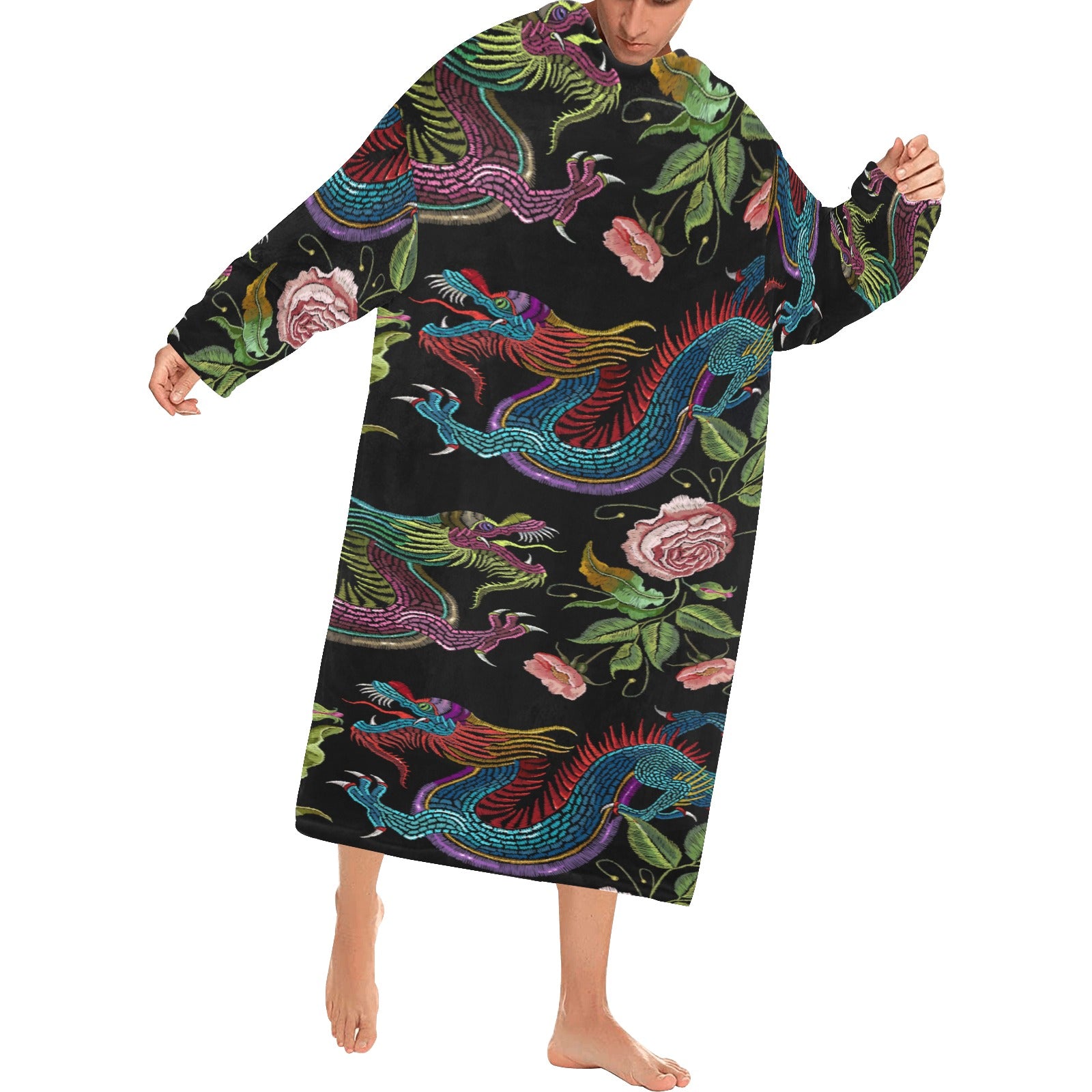 Dragons flower pattern Blanket Robe with Sleeves