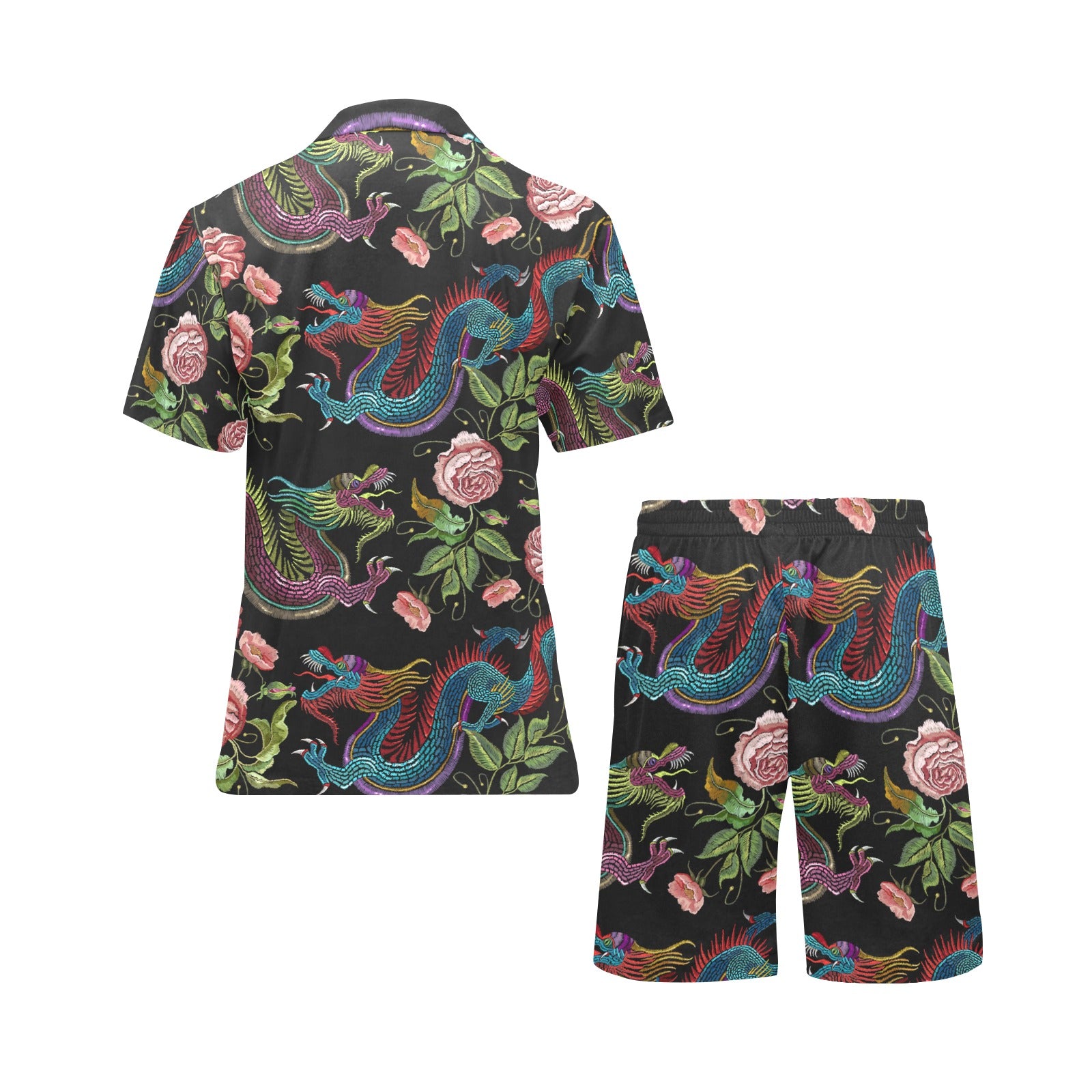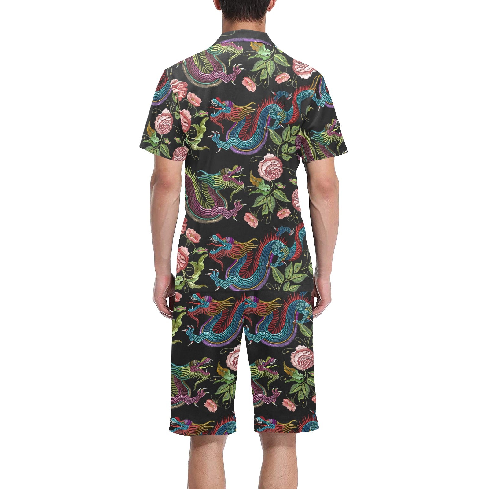 Dragons flower pattern Men's V-Neck Short Pajama Set