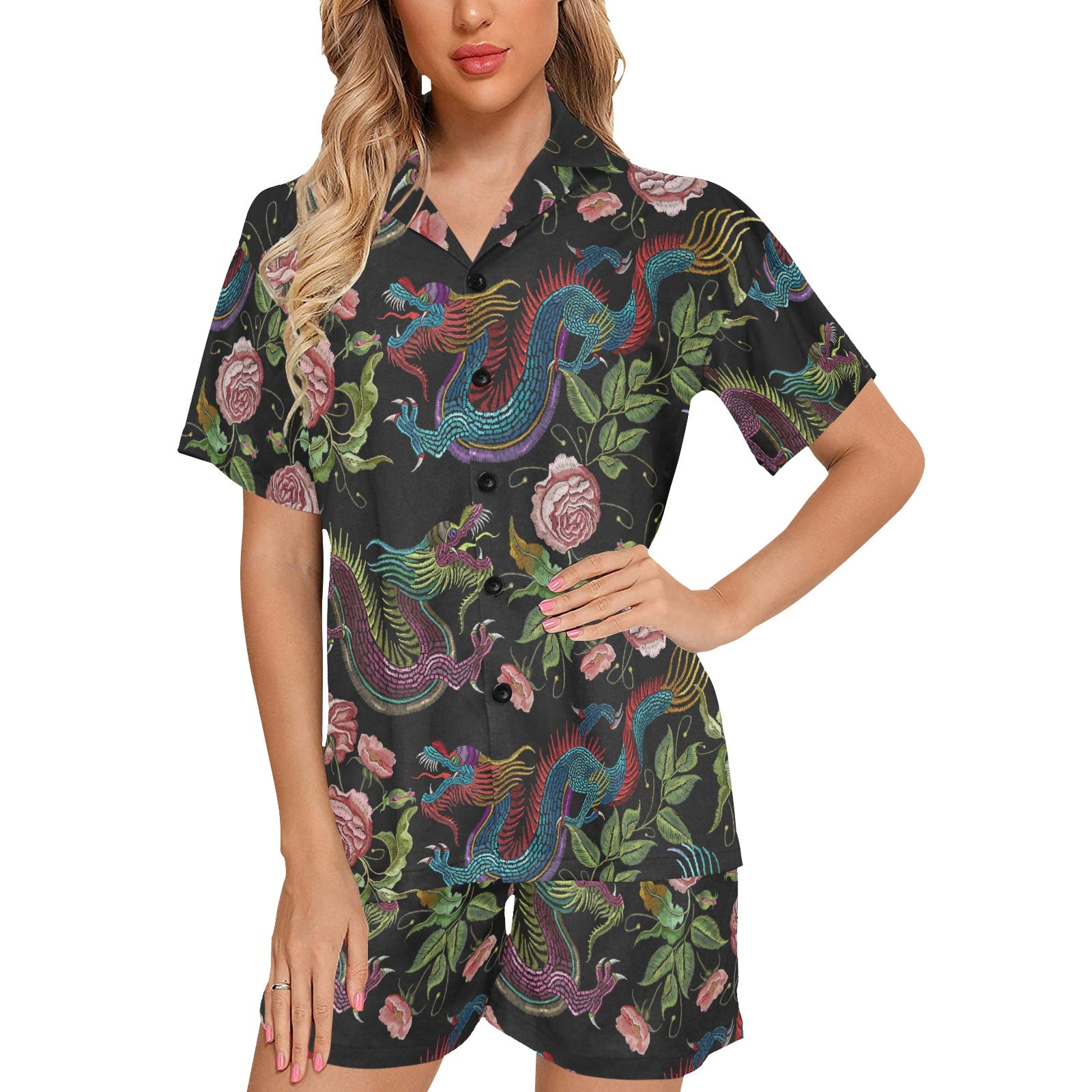 Dragons flower pattern Women's V-Neck Short Pajama Set