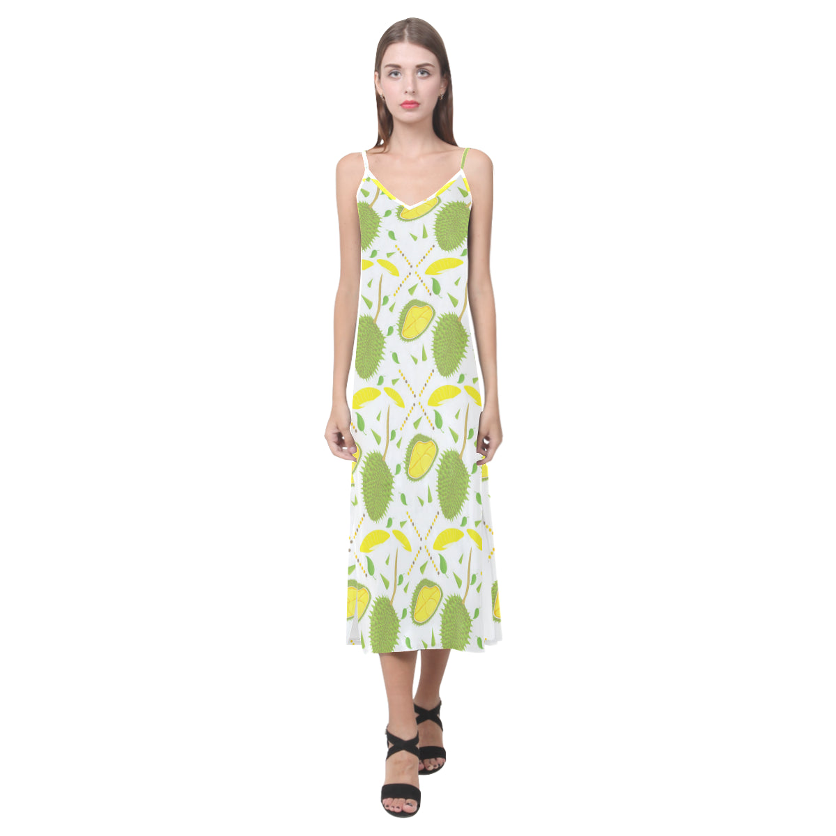 Durian pattern background V-Neck Open Fork Long Dress is a uniqued design and limited item. It made to order, hand printed, and sewn with love in our factory.