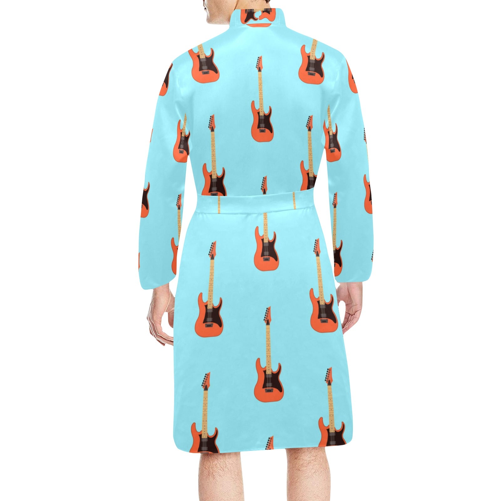 electric guitar pattern light blue background Men's Long Sleeve Belted Night Robe