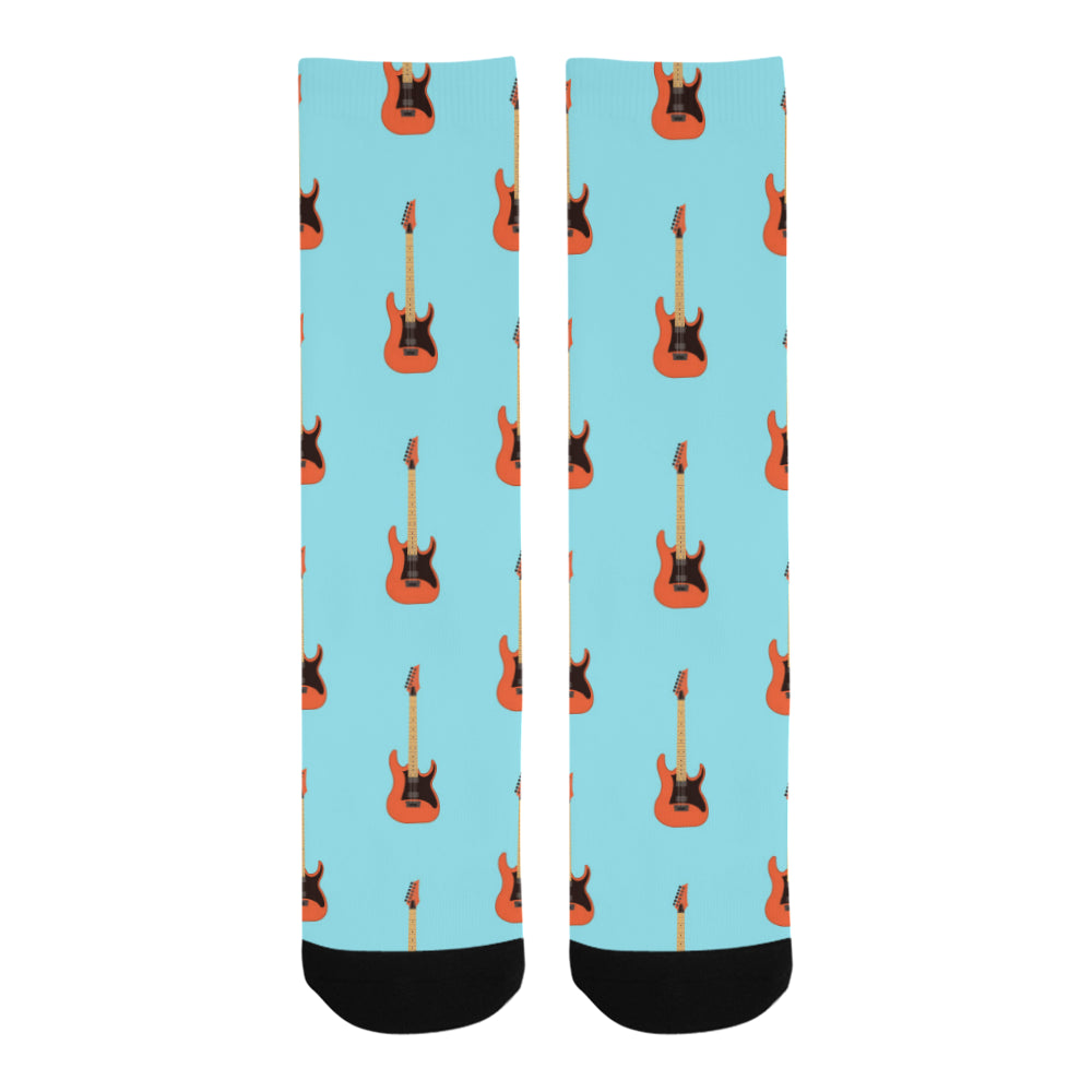 electric guitar pattern light blue background Crew Socks are uniqued design and limited item. It made to order, hand printed, and sewn with love in our factory.