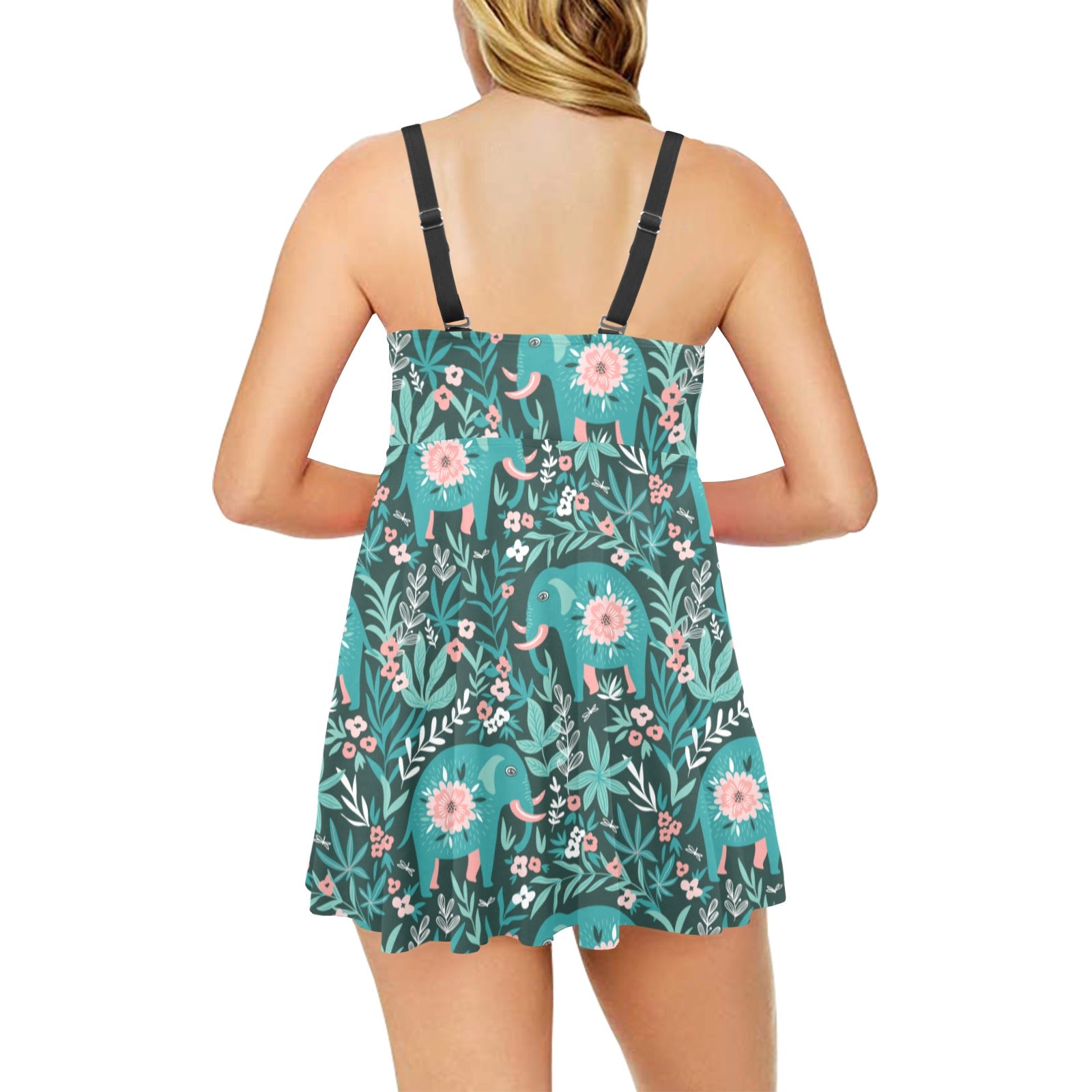 Elephants jungle pattern Chest Sexy Pleated Two Piece Swim Dress