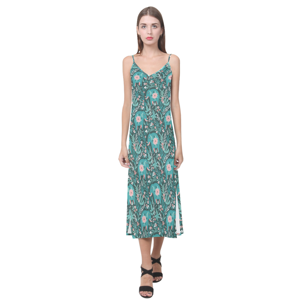 Elephants jungle pattern V-Neck Open Fork Long Dress is a uniqued design and limited item. It made to order, hand printed, and sewn with love in our factory.