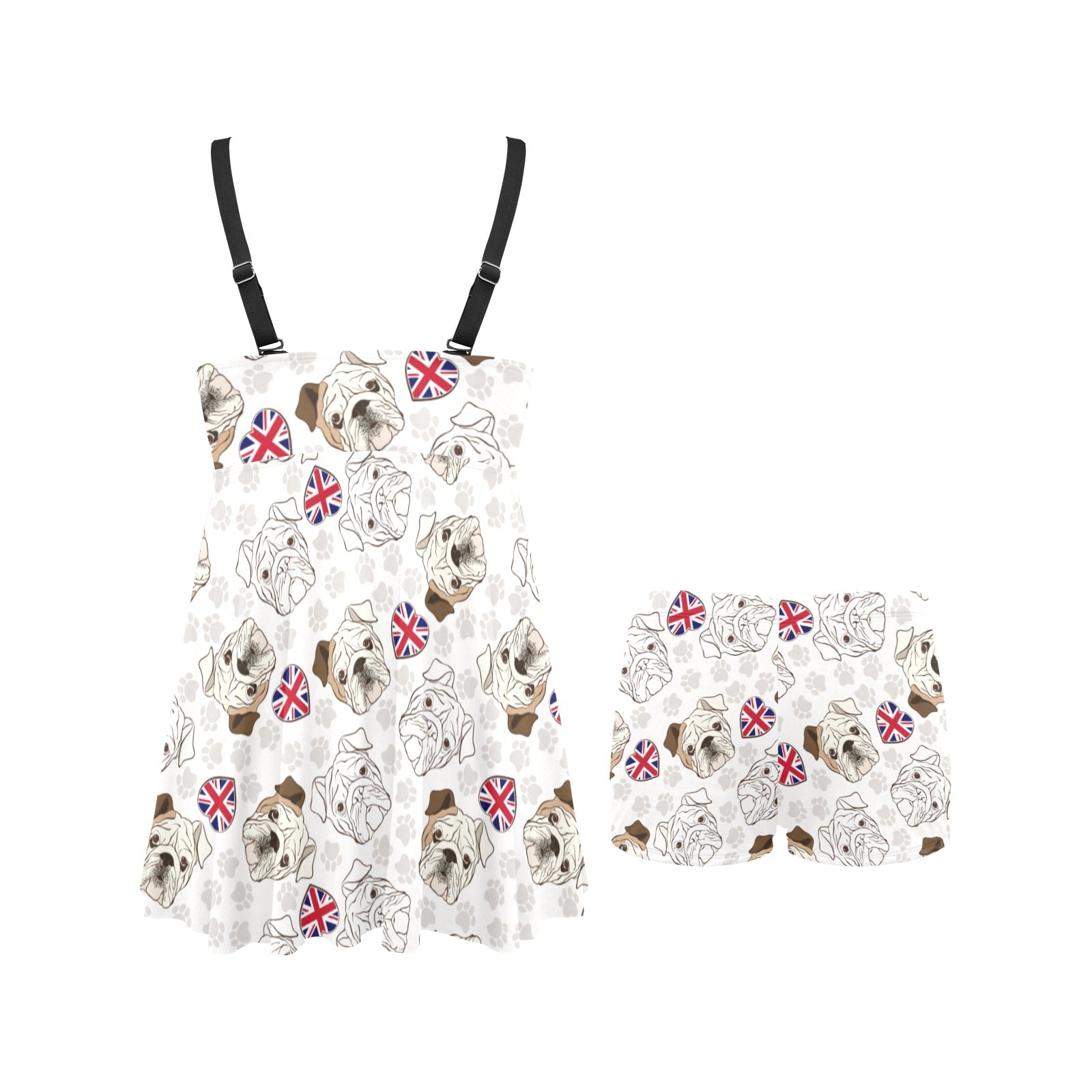English Bulldog Pattern Print Design 01 Chest Sexy Pleated Two Piece Swim Dress