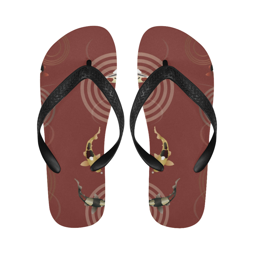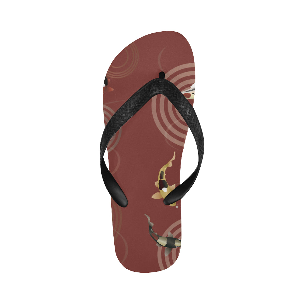 Fancy Carp red background Unisex Flip Flops is a uniqued design and limited item. It made to order, hand printed, and sewn with love in our factory.