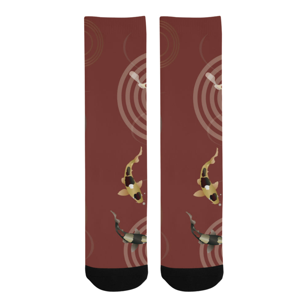 Fancy Carp red background Crew Socks are uniqued design and limited item. It made to order, hand printed, and sewn with love in our factory.