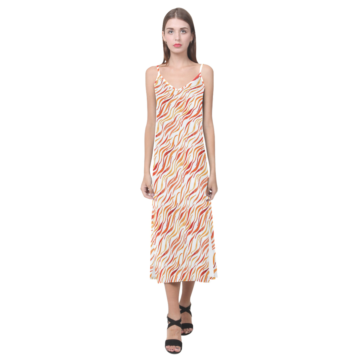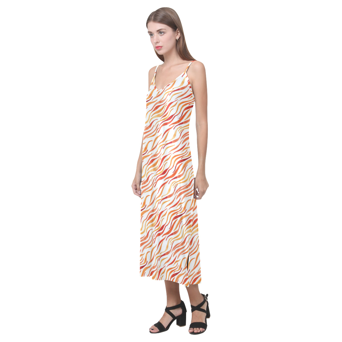Fire flame watercolor pattern V-Neck Open Fork Long Dress is a uniqued design and limited item. It made to order, hand printed, and sewn with love in our factory.