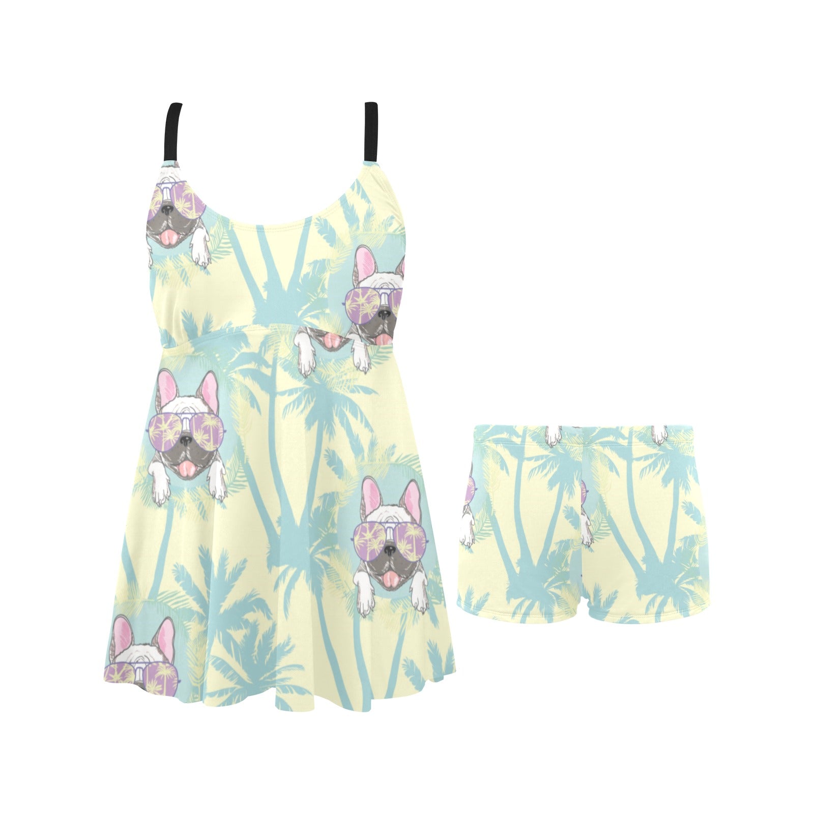 French bulldog hawaii blackground Chest Sexy Pleated Two Piece Swim Dress
