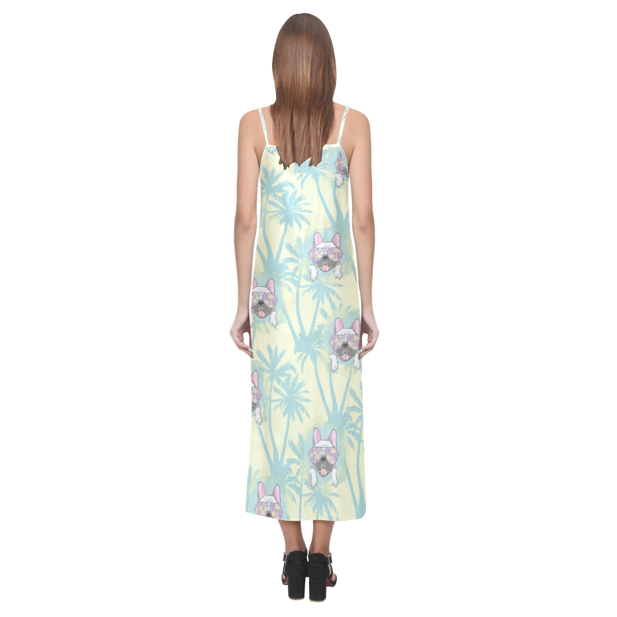 French bulldog hawaii blackground V-Neck Open Fork Long Dress