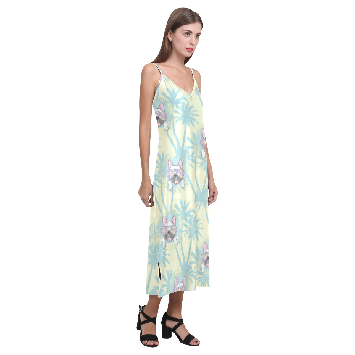 French bulldog hawaii blackground V-Neck Open Fork Long Dress is a uniqued design and limited item. It made to order, hand printed, and sewn with love in our factory.