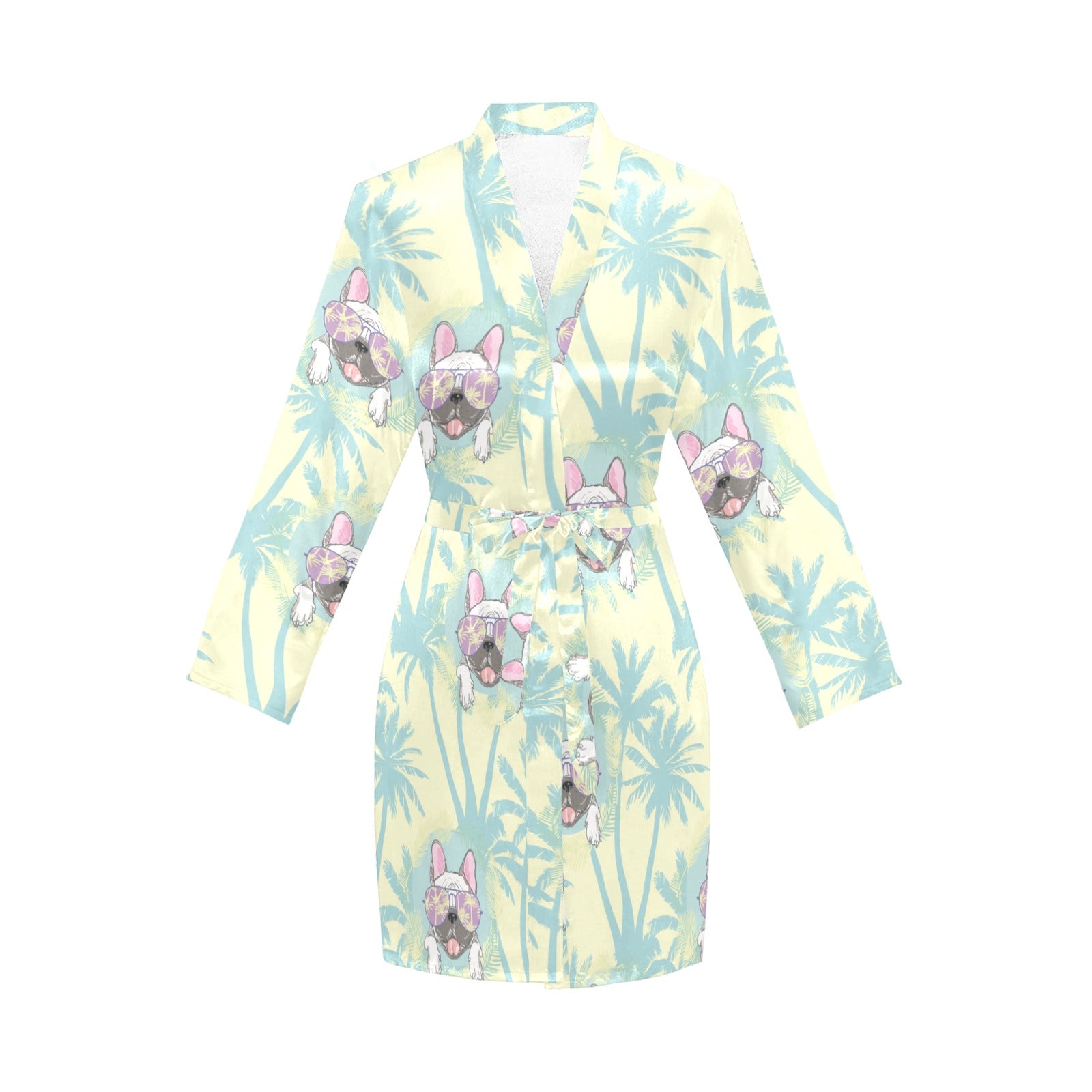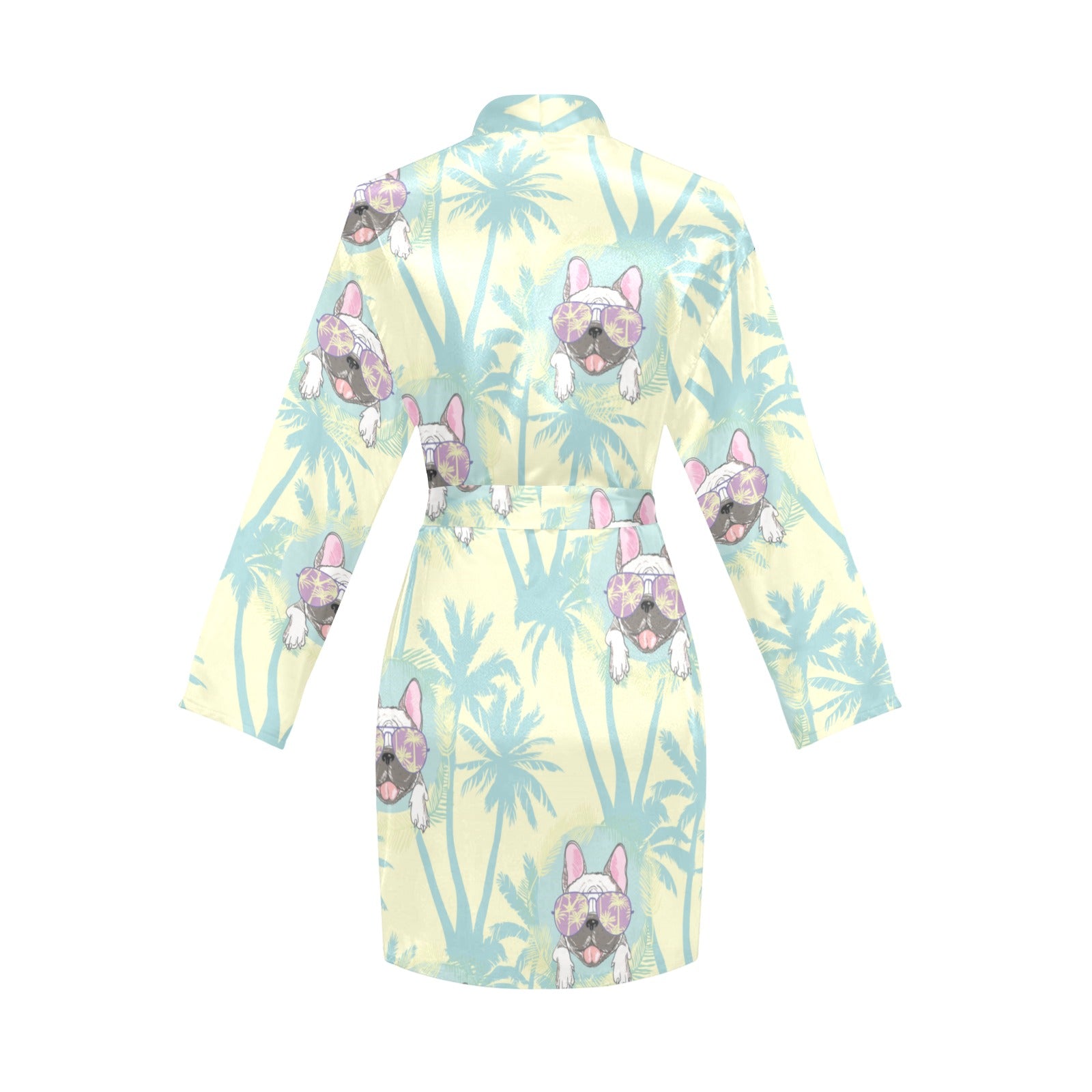French bulldog hawaii blackground Women's Long Sleeve Belted Night Robe