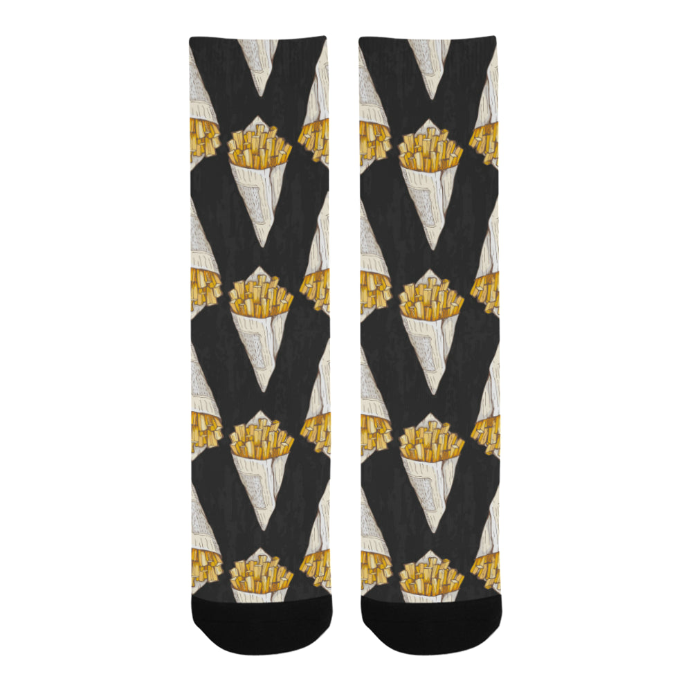 French fries dark background Crew Socks are uniqued design and limited item. It made to order, hand printed, and sewn with love in our factory.