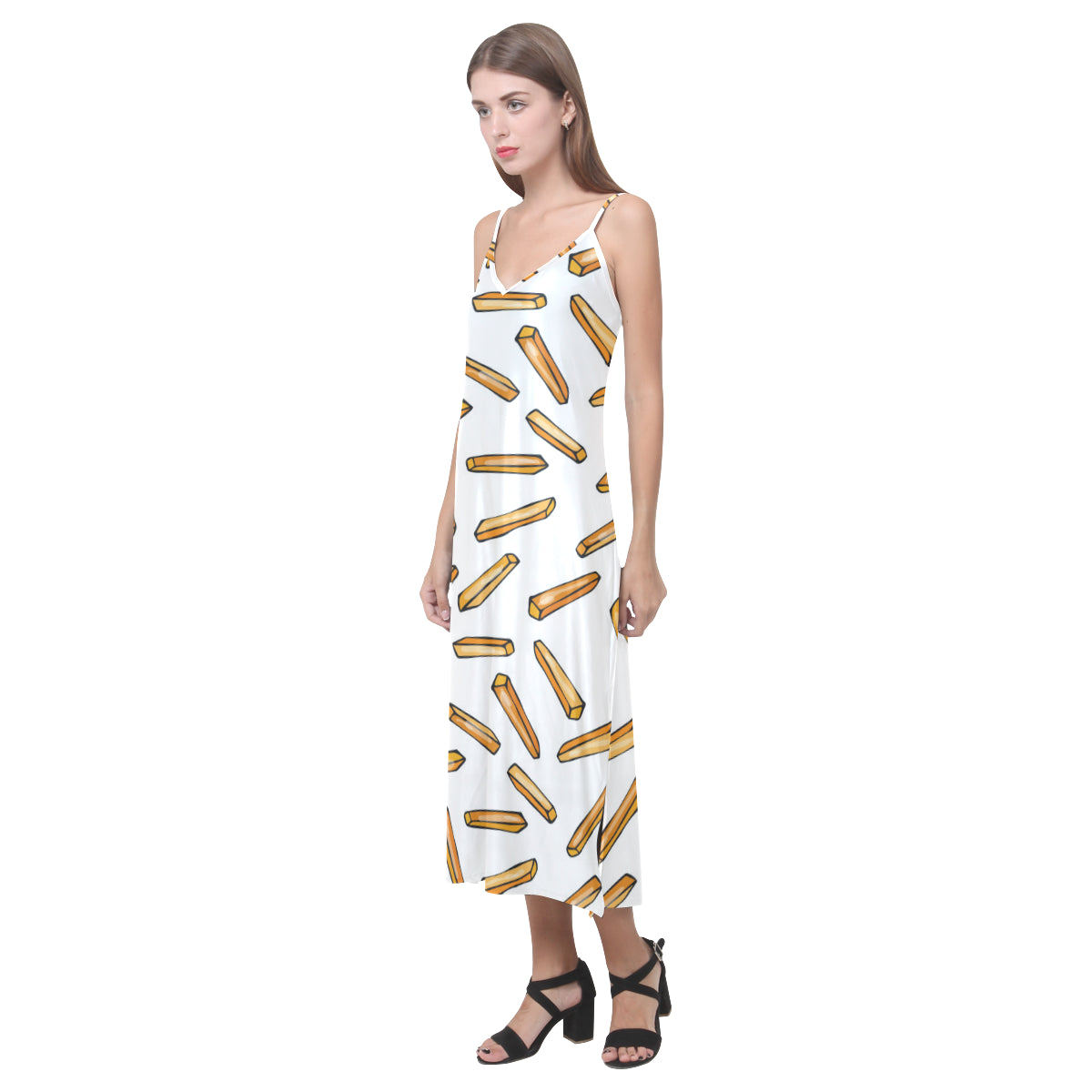 French fries potato pattern V-Neck Open Fork Long Dress is a uniqued design and limited item. It made to order, hand printed, and sewn with love in our factory.