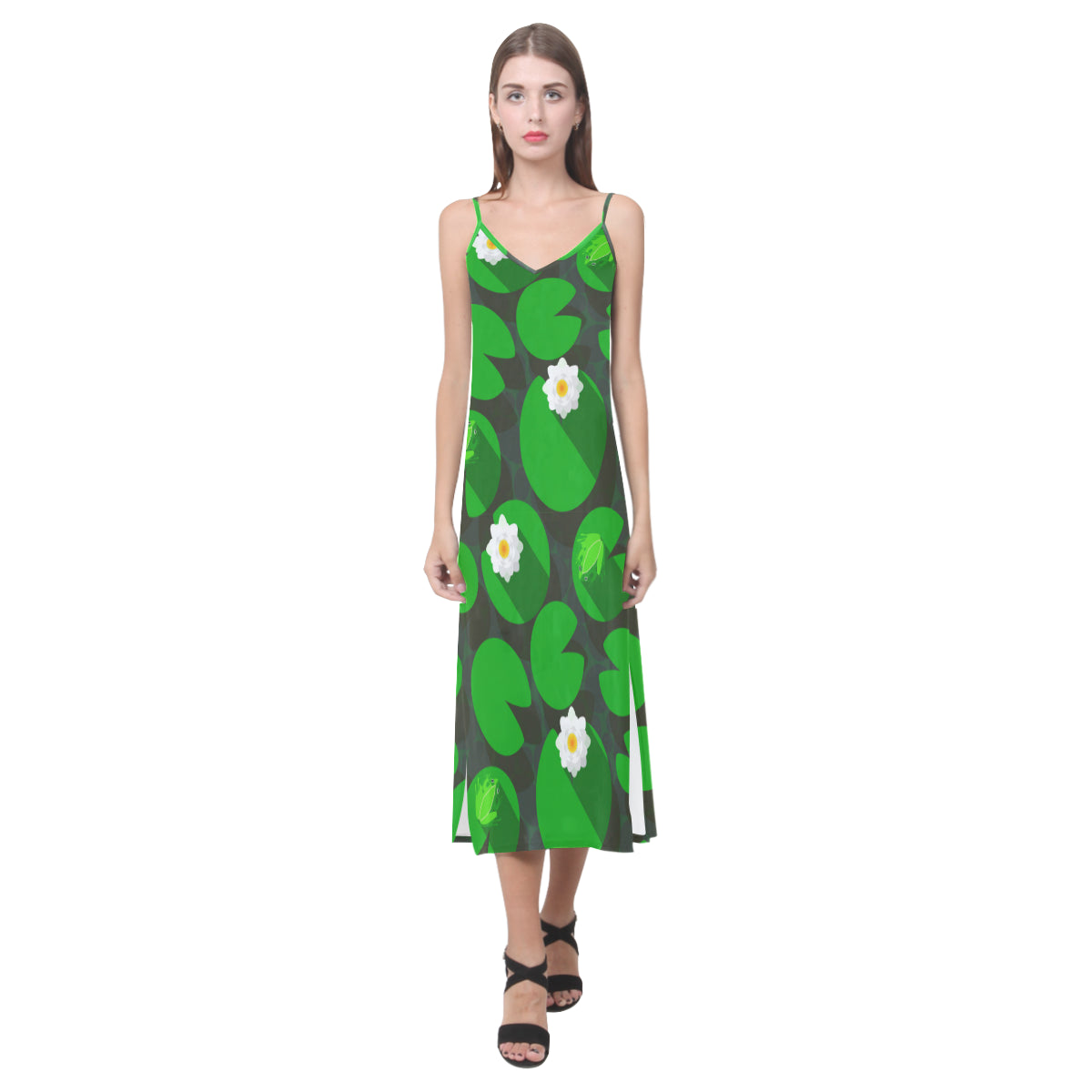 Frog waterlily pattern V-Neck Open Fork Long Dress is a uniqued design and limited item. It made to order, hand printed, and sewn with love in our factory.