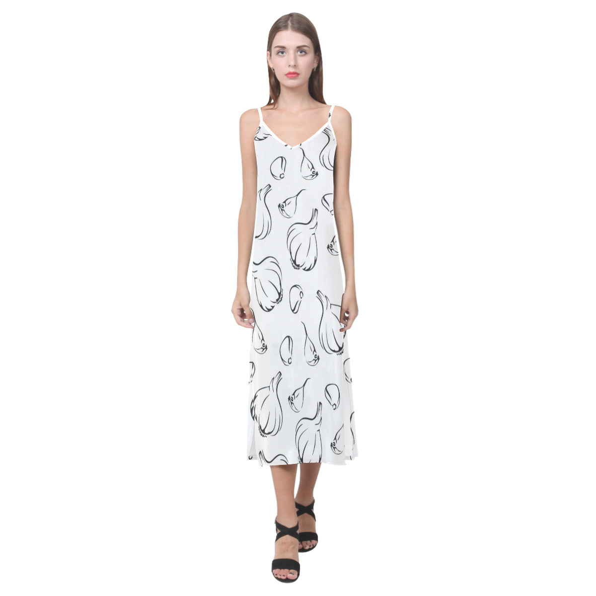 Garlic pattern black white V-Neck Open Fork Long Dress is a uniqued design and limited item. It made to order, hand printed, and sewn with love in our factory.