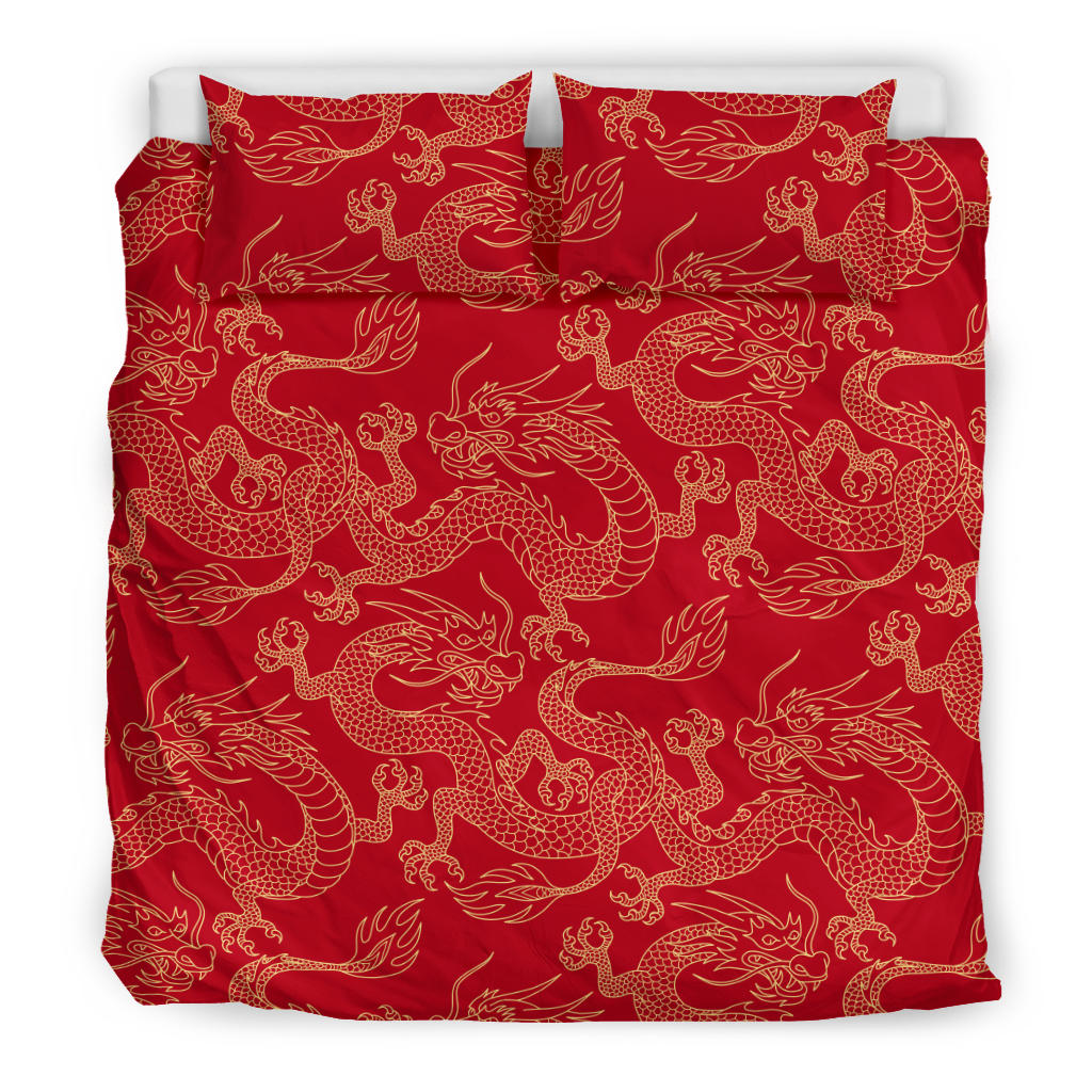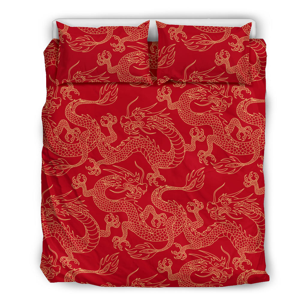 Gold dragons red background Bedding Set is a uniqued design and limited item. It made to order, hand printed, and sewn with love in our factory.