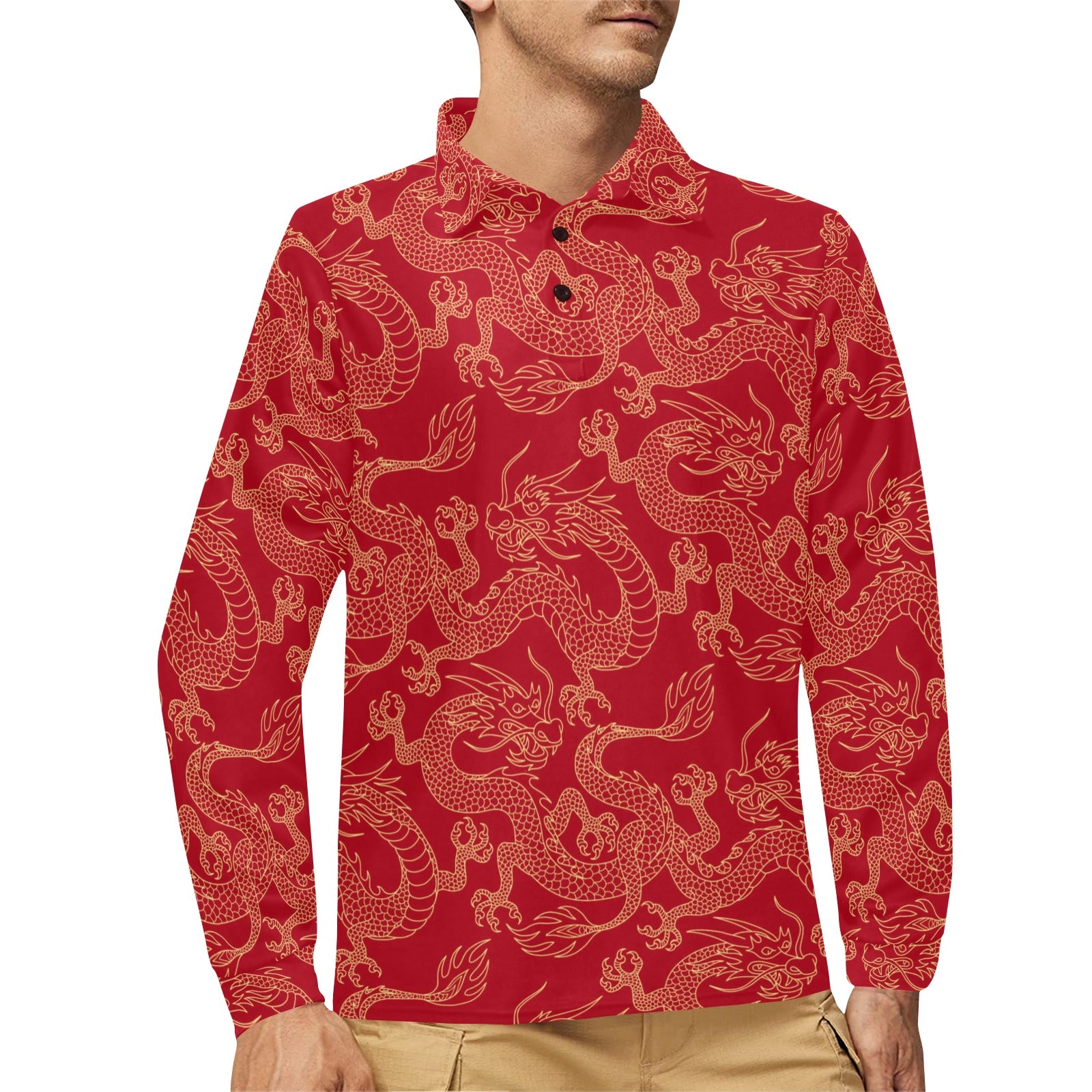 Gold dragons red background Men's Long Sleeve Polo Shirt