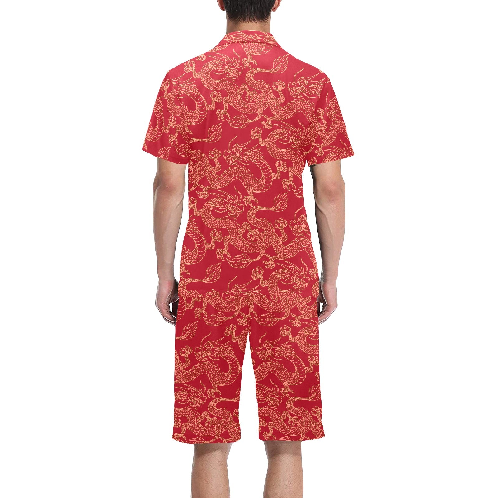 Gold dragons red background Men's V-Neck Short Pajama Set