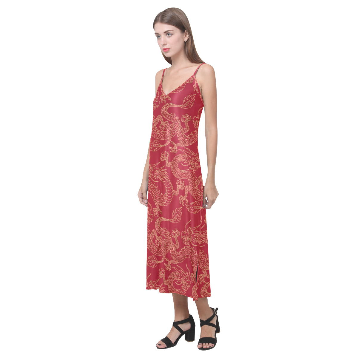 Gold dragons red background V-Neck Open Fork Long Dress is a uniqued design and limited item. It made to order, hand printed, and sewn with love in our factory.