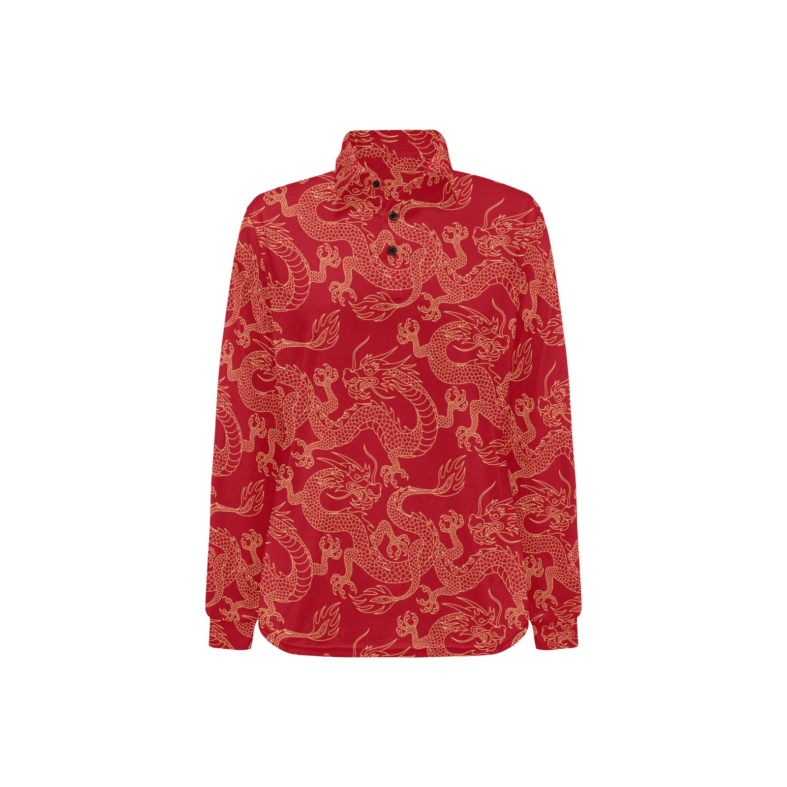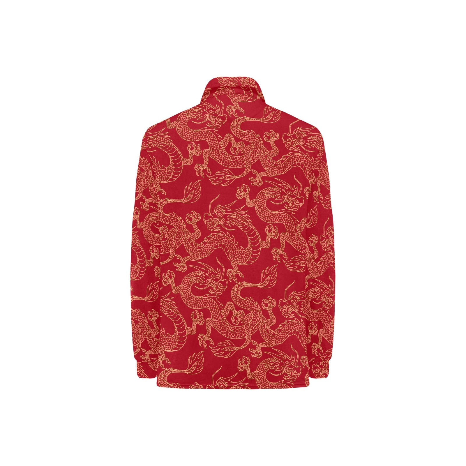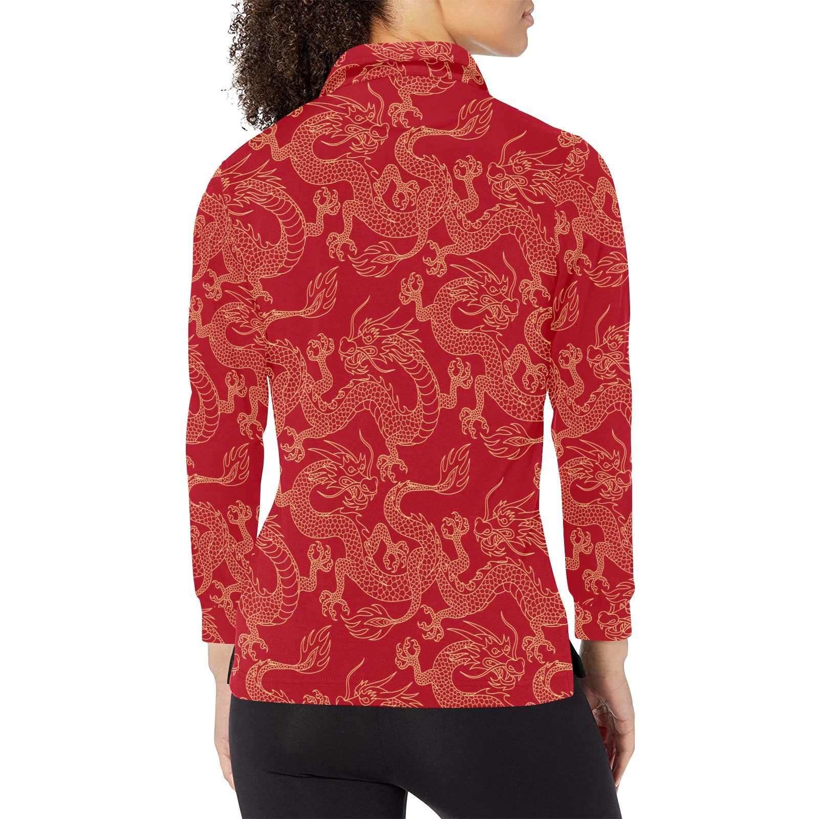 Gold dragons red background Women's Long Sleeve Polo Shirt