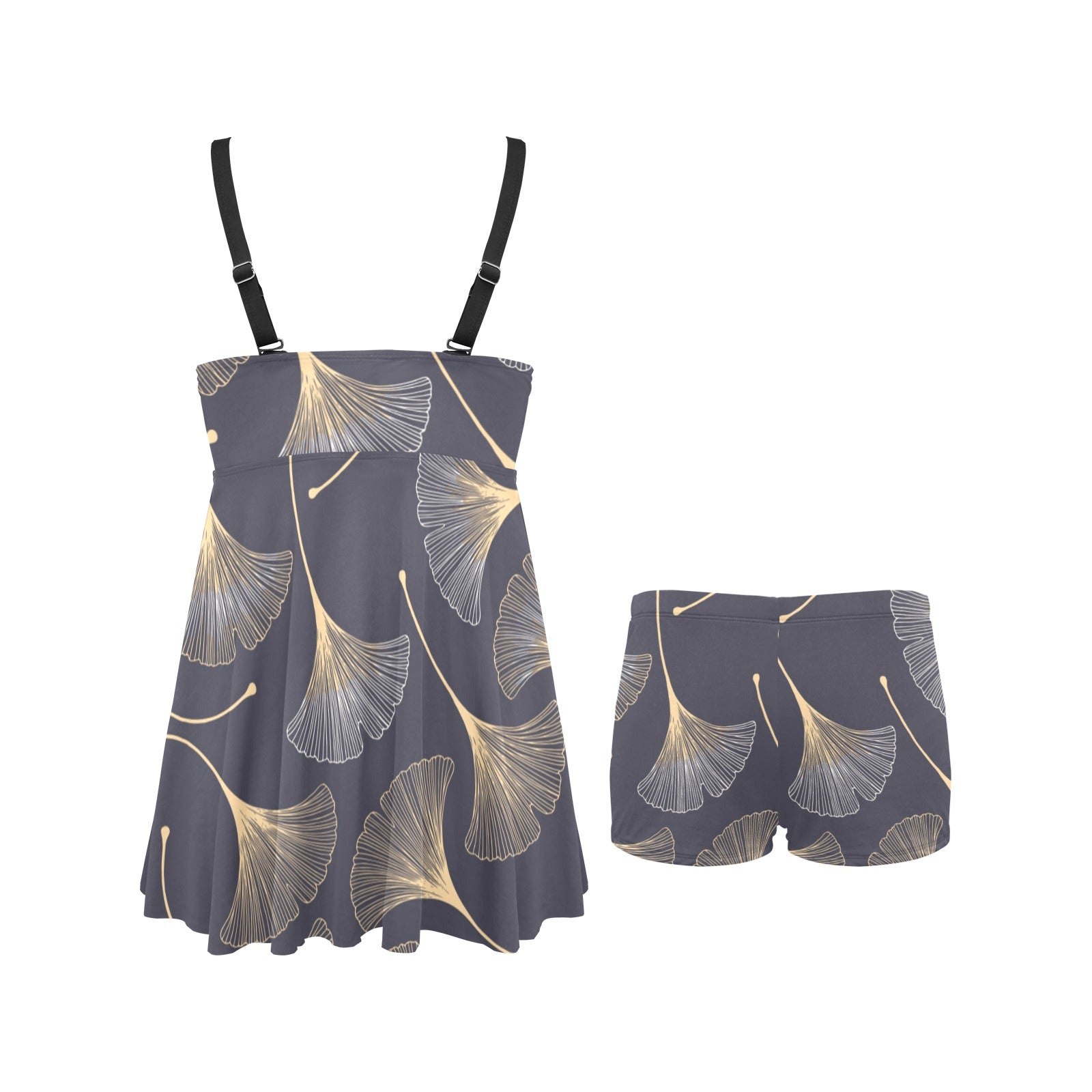 Gold ginkgo leaves Chest Sexy Pleated Two Piece Swim Dress