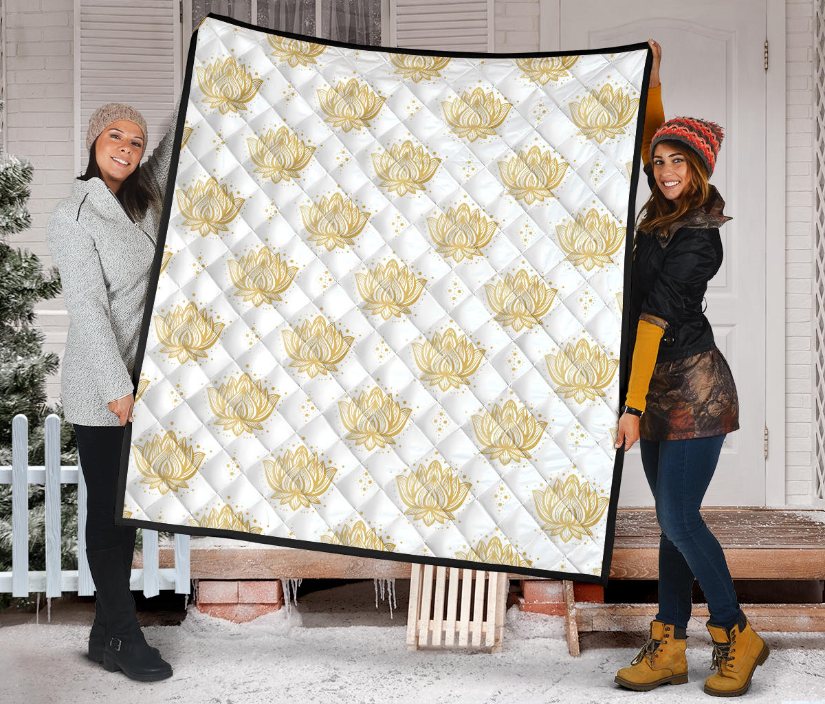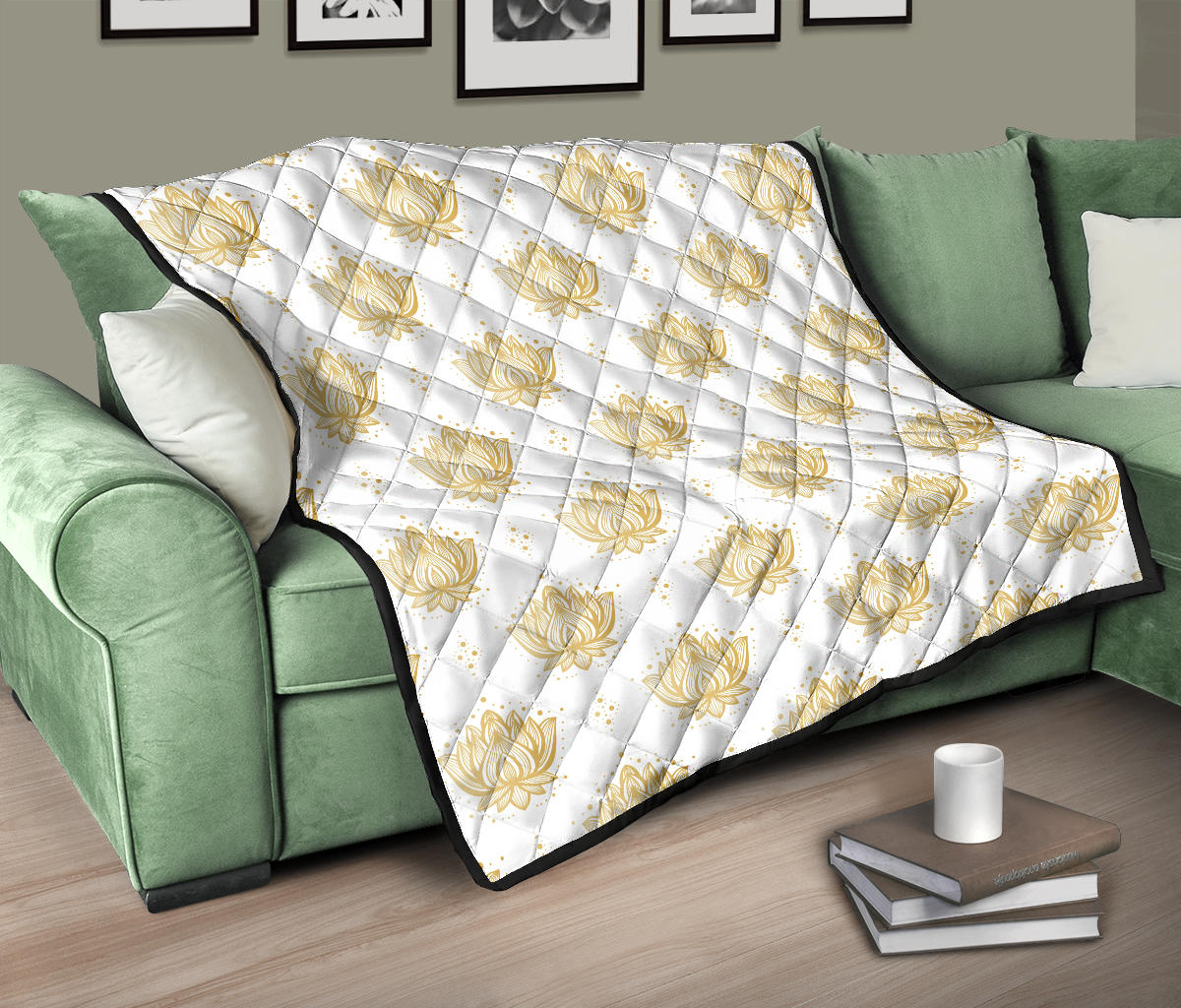 Gold Ornamental Lotue Waterlily Symbol Pattern Premium Quilt is a uniqued design and limited item. It made to order, hand printed, and sewn with love in our factory.