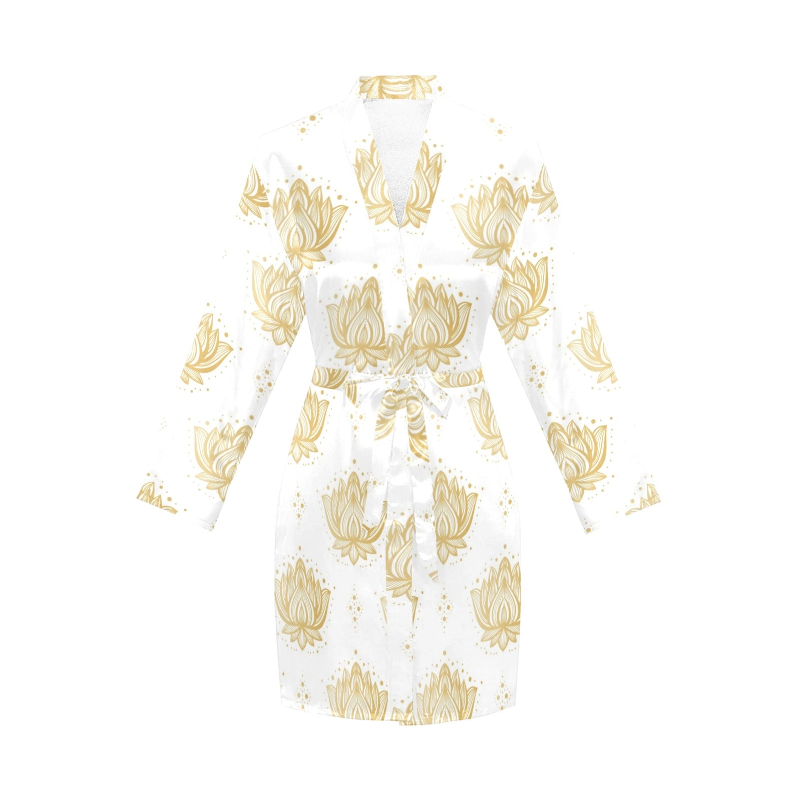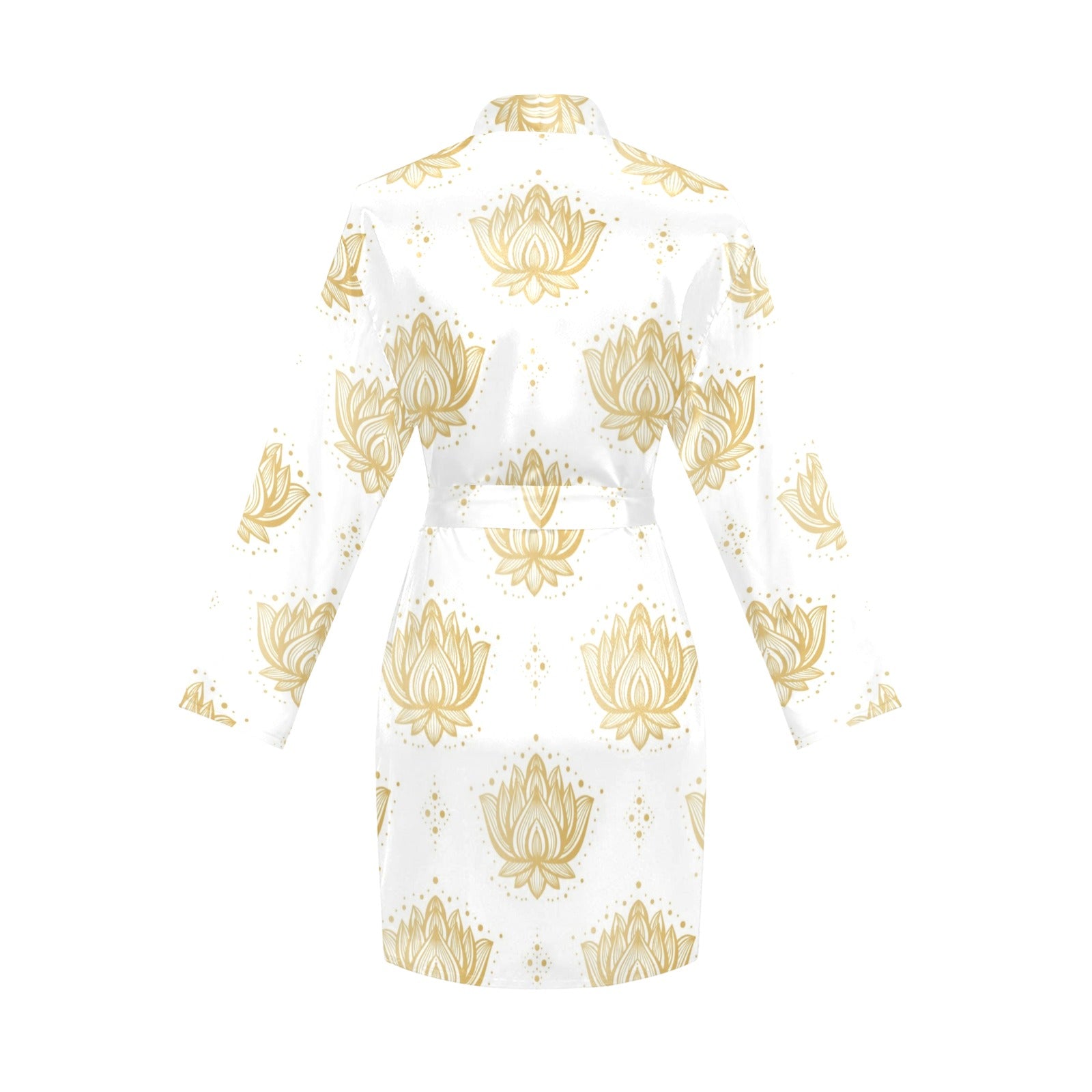 Gold Ornamental lotue waterlily symbol pattern Women's Long Sleeve Belted Night Robe