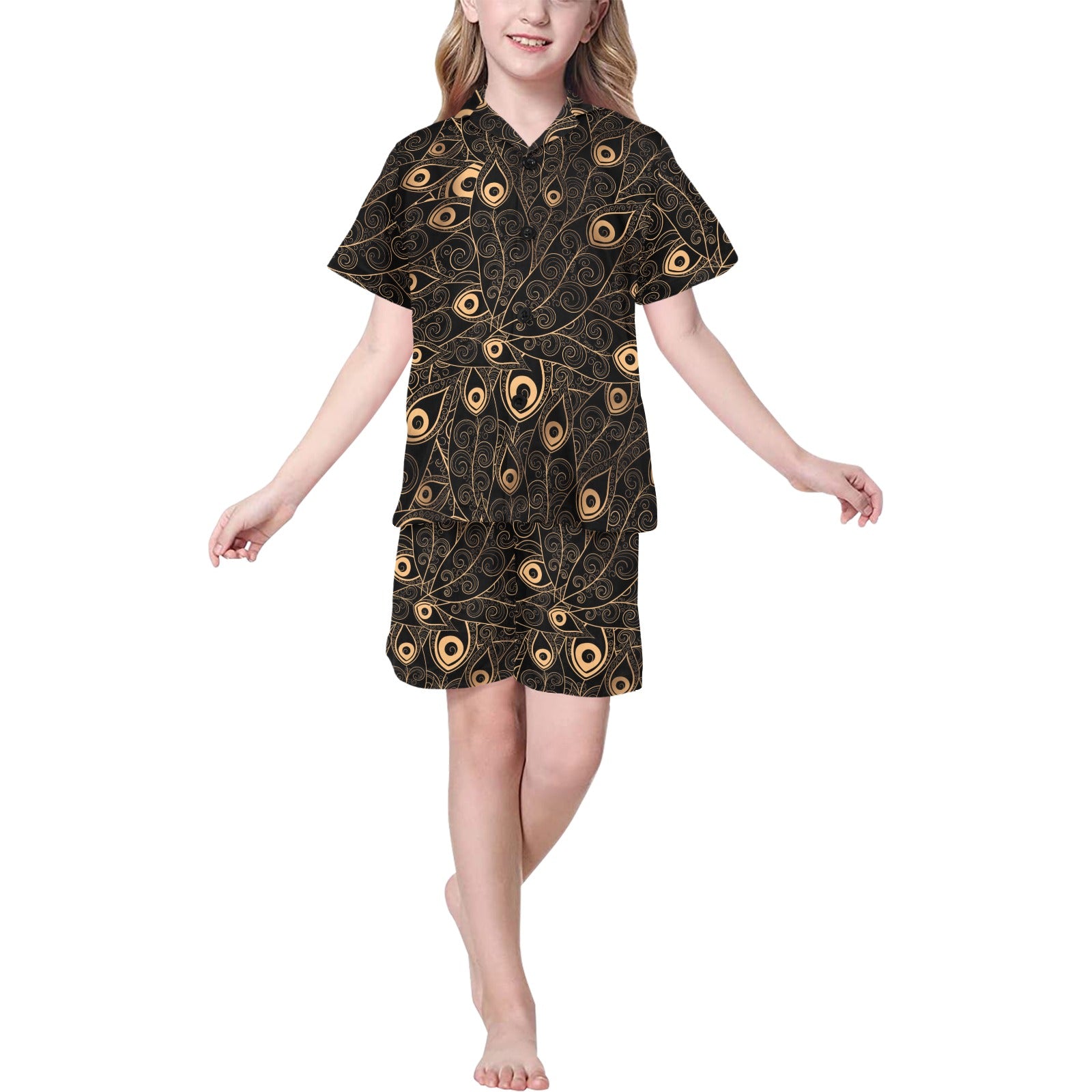 Gold peacock feather pattern Kids' Boys' Girls' V-Neck Short Pajama Set