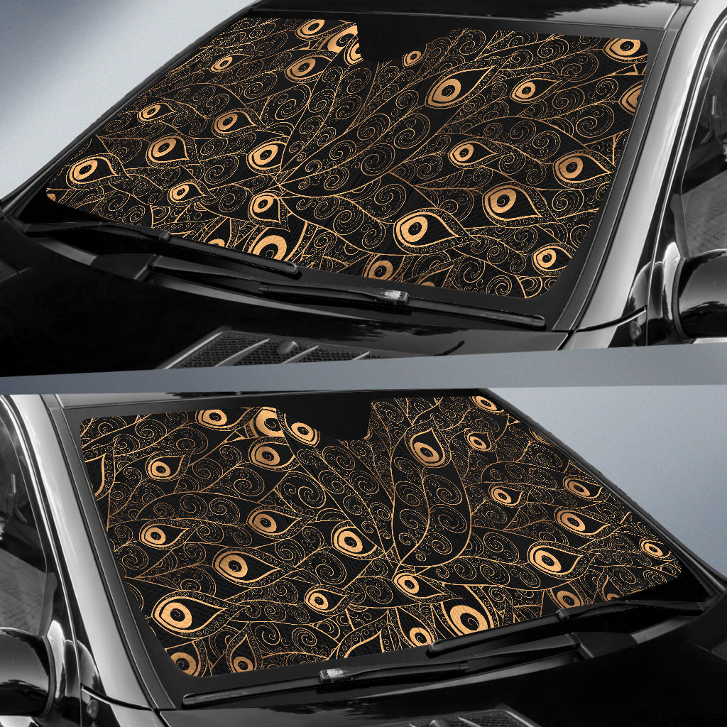 Gold peacock feather pattern Car Sun Shade is a uniqued design and limited item. It made to order, hand printed, and sewn with love in our factory.