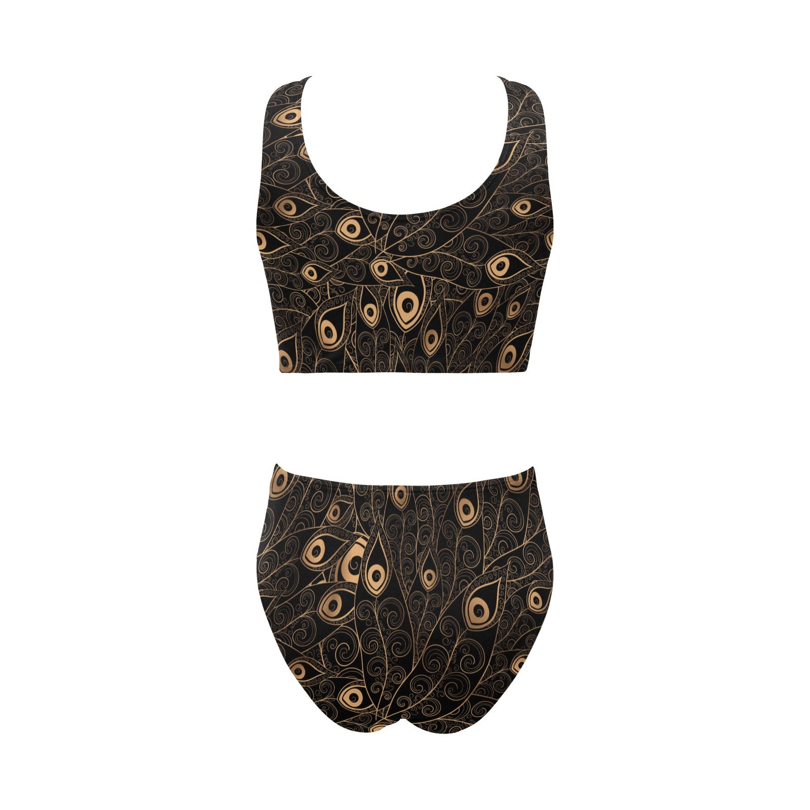 Gold peacock feather pattern Chest Bowknot High Waisted Bikini Swimsuit
