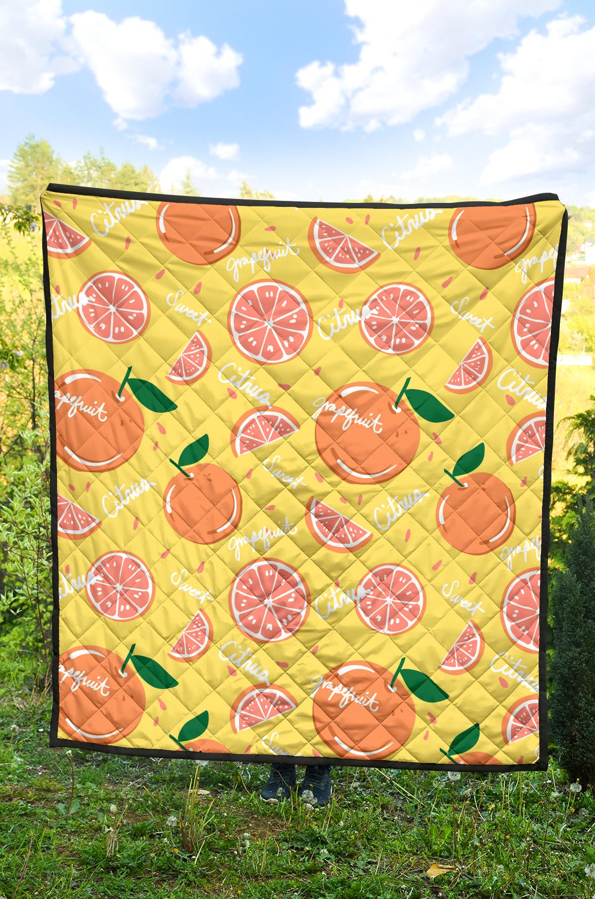 Grapefruit Yellow Background Premium Quilt is a uniqued design and limited item. It made to order, hand printed, and sewn with love in our factory.