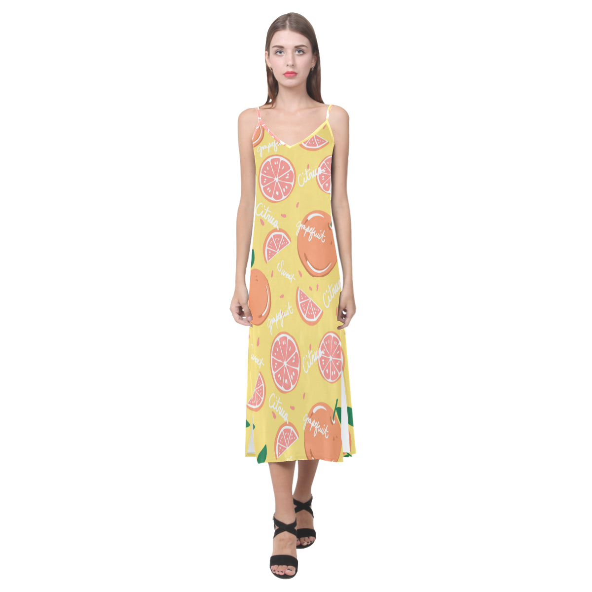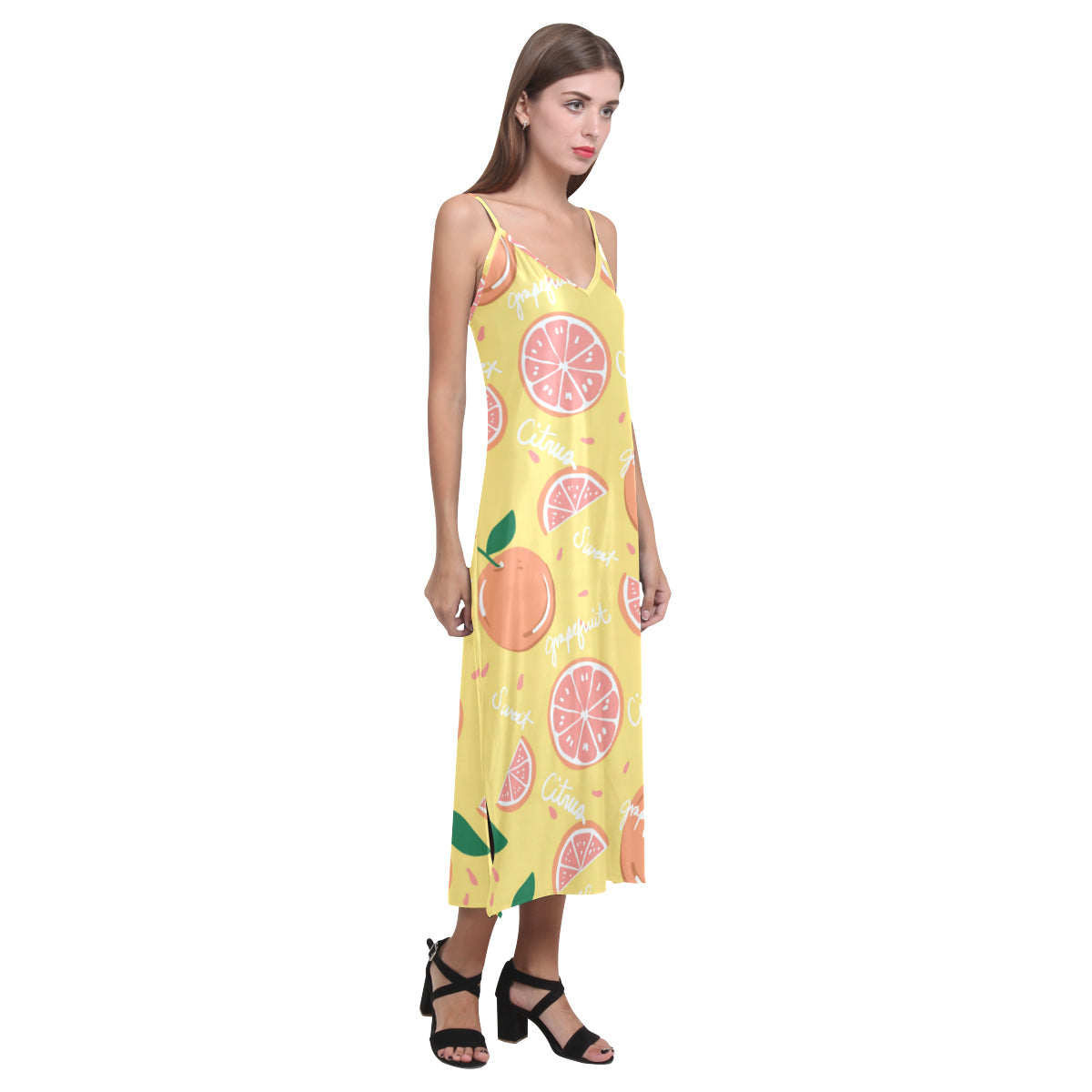 Grapefruit yellow background V-Neck Open Fork Long Dress is a uniqued design and limited item. It made to order, hand printed, and sewn with love in our factory.