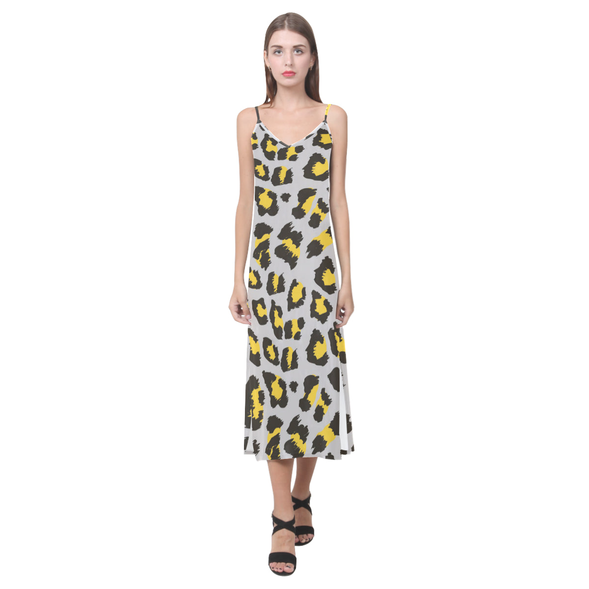 Gray Leopard print pattern V-Neck Open Fork Long Dress is a uniqued design and limited item. It made to order, hand printed, and sewn with love in our factory.